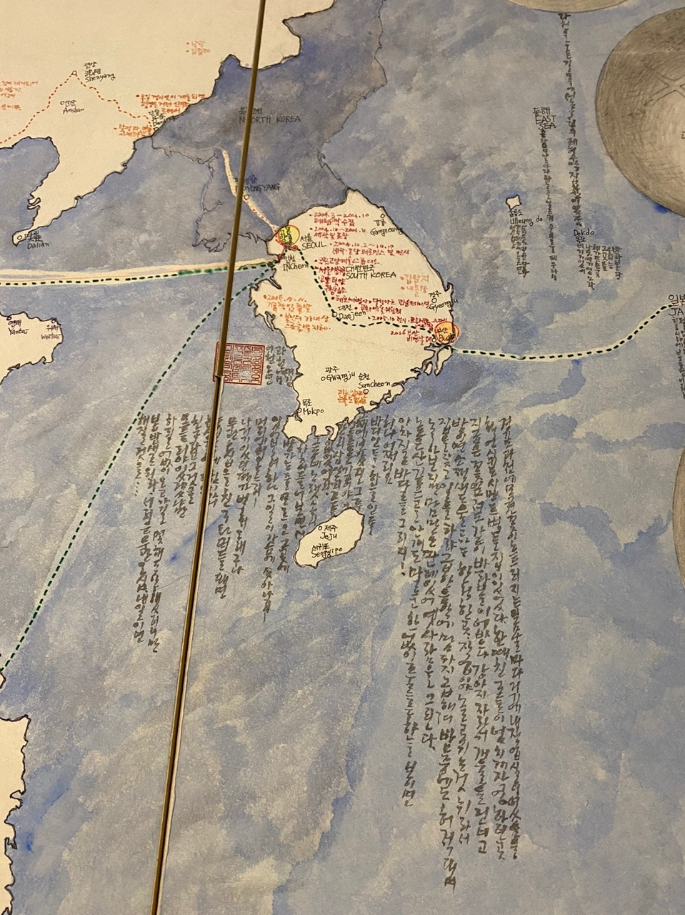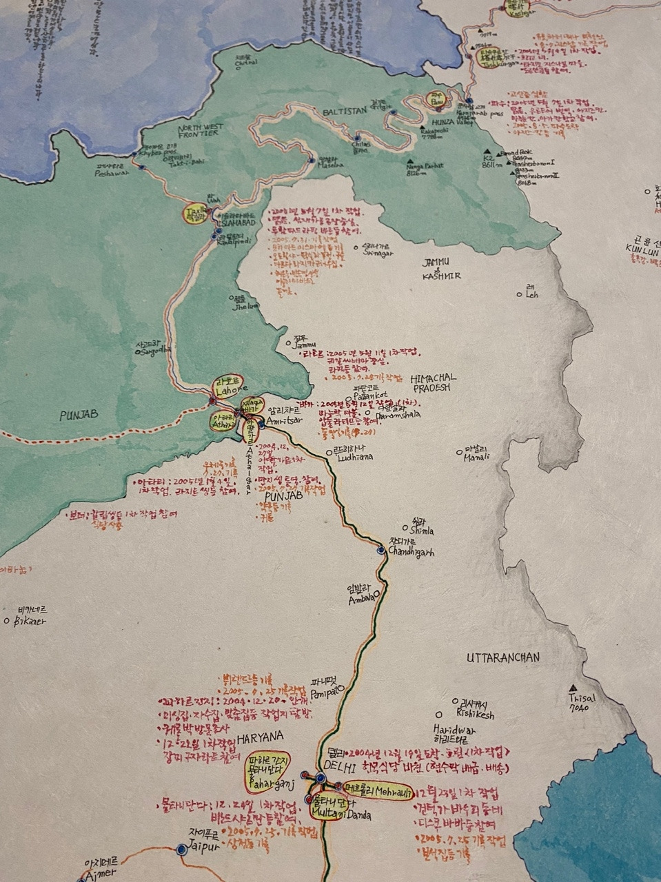 이는 정재철의 <1차 실크로드 프로젝트 - 루트맵 드로잉 1>(2006)으로, 그가 실크로드 프로젝트로 방문한 경로를 다수의 루트맵 드로잉으로 남긴 것이다. 이 루트맵 드로잉 속에는 1차 여정의 종료 이후 경로와 지역을 기록하고, 2차, 3차의 계획이 담겨있다. 다음 여정의 예견된 장소와 시간의 기록이 그려진 루트맵에는 이미 종료한 이 프로젝트에 시간성을 기입하고 과거의 정재철이 향했던 내일을 마주치게 한다.