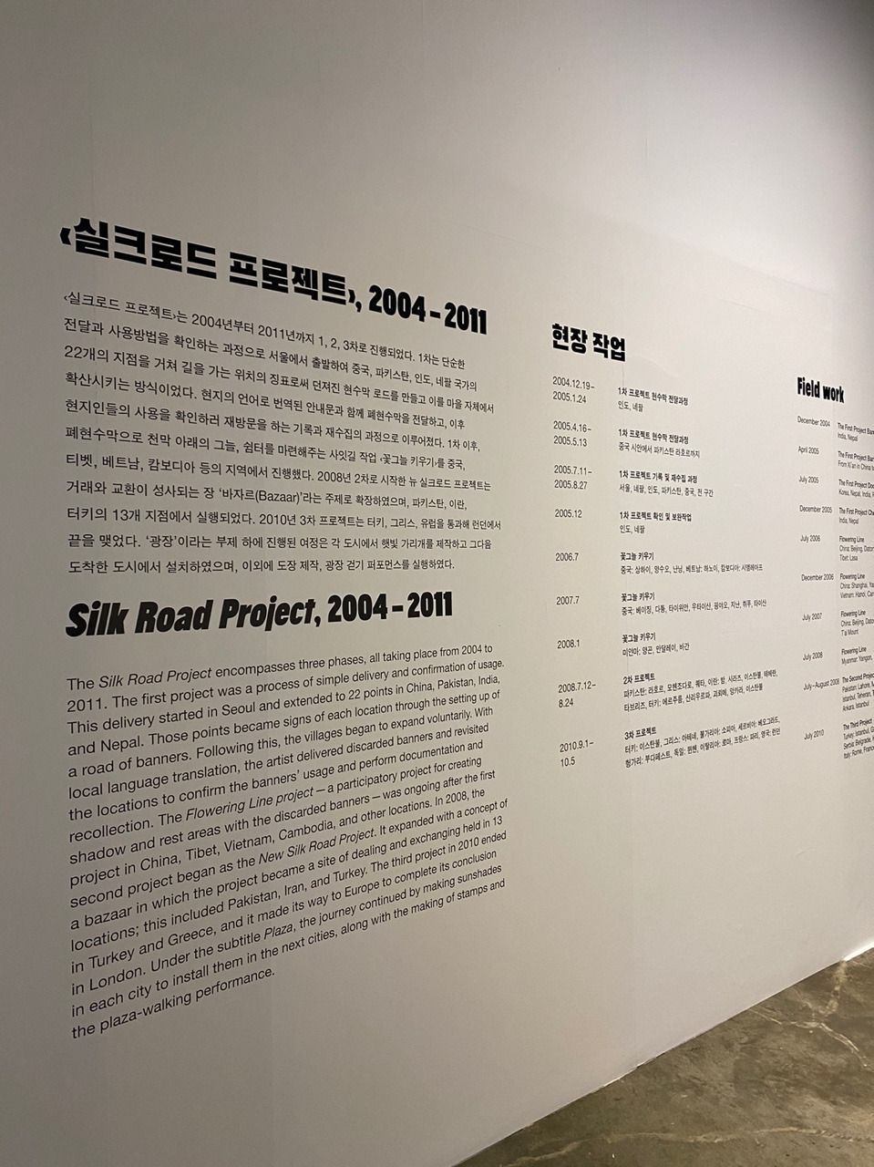 1차 실크로드 프로젝트(실크로드 프로젝트) 영상은 세탁, 포장, 전달, 재방문을 통한 기록의 과정, 2차 실크로드 프로젝트(뉴 실크로드 프로젝트) 영상은 현지인들과 공동 제작하고 그늘을 만드는 과정, 3차 실크로드 프로젝트 영상은 현지 수공예 장인들의 참여로 점차 자라나는 실크로드 프로젝트 과정을 담고 있다.