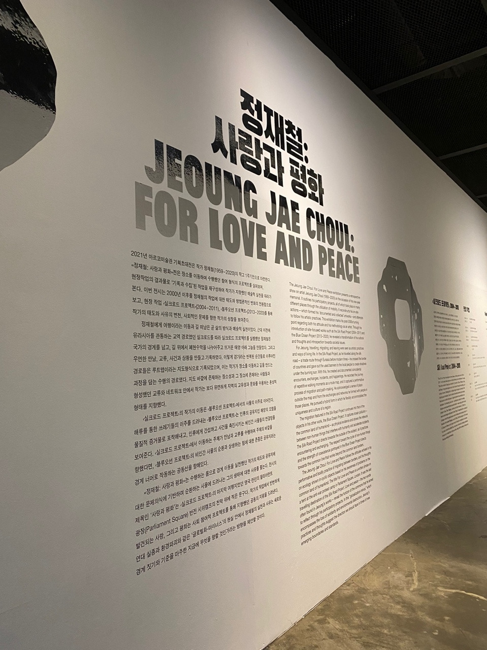 혜화에 위치한 아르코 미술관에서는 현재 작가 정재철(1959-2020)의 작고 1주기전으로 작가의 작업세계를 조망하는 기획초대전 <정재철: 사랑과 평화>가 진행 중이다. 이번 전시에서는 작가가 장소를 이동하며 수행했던 참여 형식의 프로젝트의 결과물을 통해 그가 지향한 예술적 실천에 한 걸음 다가가고자 한다. 전시는 총 두 전시실로 나뉘어 있으며, 각 공간은 공통의 목적성을 지니며 각자의 분위기를 뿜어낸다.