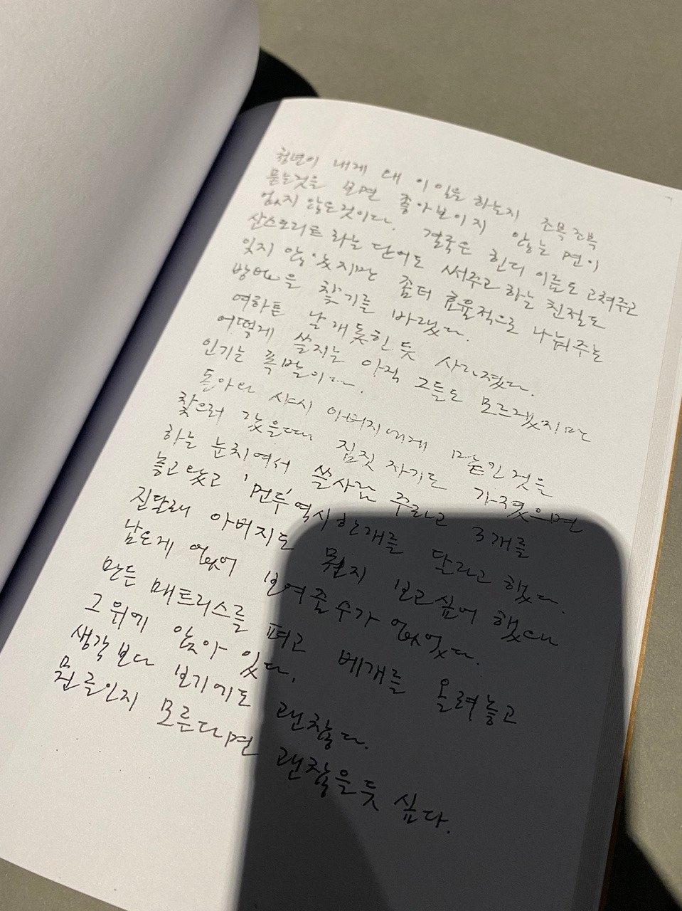 고등학교 1학년, 수련회 때였다. 하루 동안 느낀 것들이 그렇게나 많았는지, 소등 후 깜깜한 숙소에서 수첩도 아니고 관광지 소개 브로셔에 내가 느낀 모든 것들을 검은 모나미 볼펜으로 휘갈겨 썼다. 다음 날 아침, 뭐라고 썼는지도 모르는 글자들이 이리저리 겹쳐있었다. 그게 내 강박의 시작이었다. 잊을지도 모른다는 두려움과 잊지 않겠다는 욕망이 뒤섞인 강박.