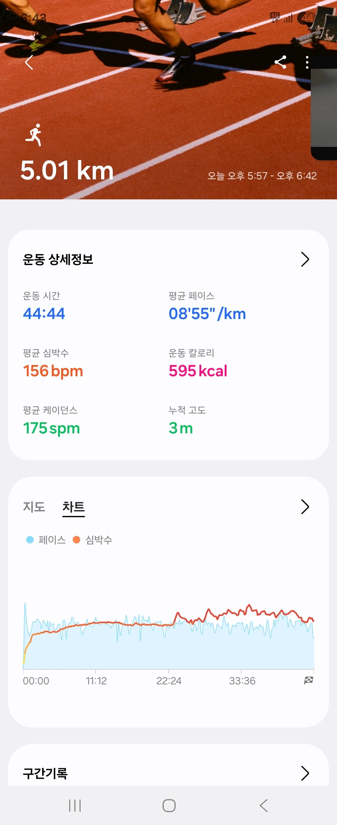5.01km · 44분 44초 · 8'55"/km · 595kcal