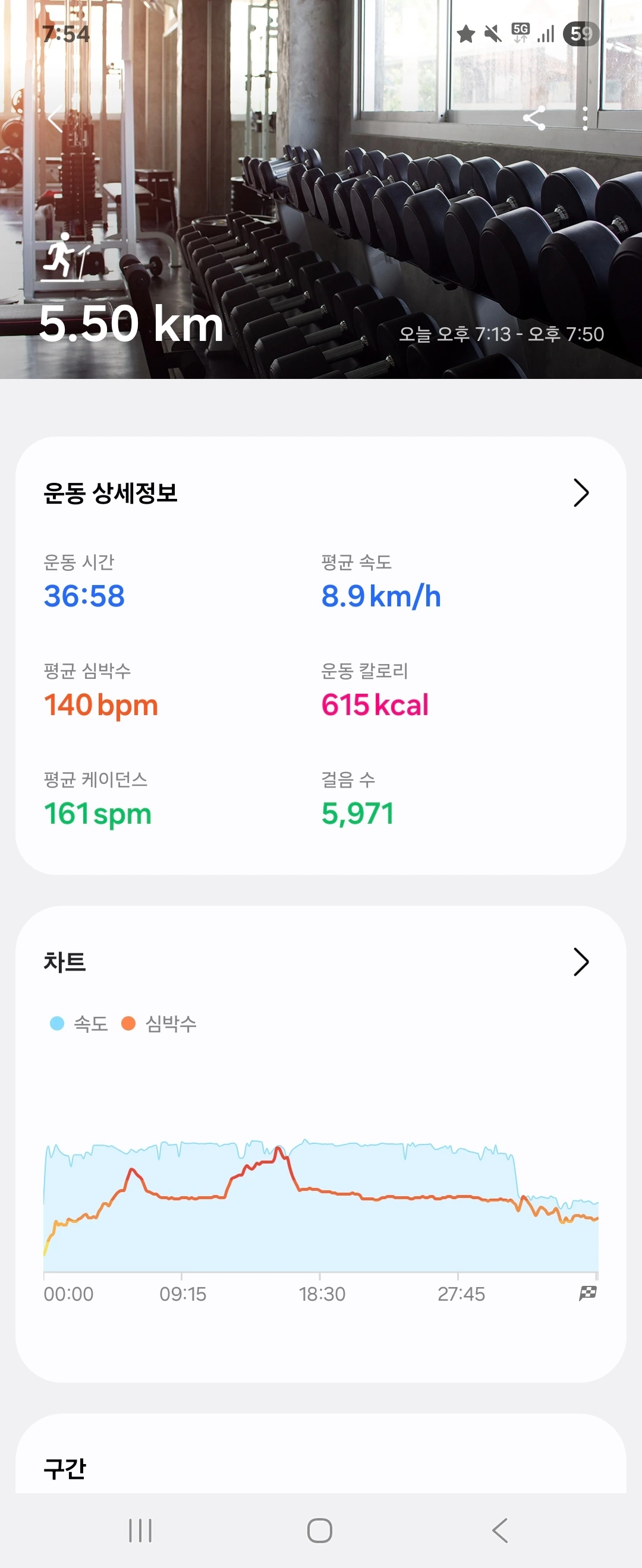 5.50km · 36:58 · 8'09"/km · 615kcal · 평균심박 140 bpm · 케이던스 161 spm
