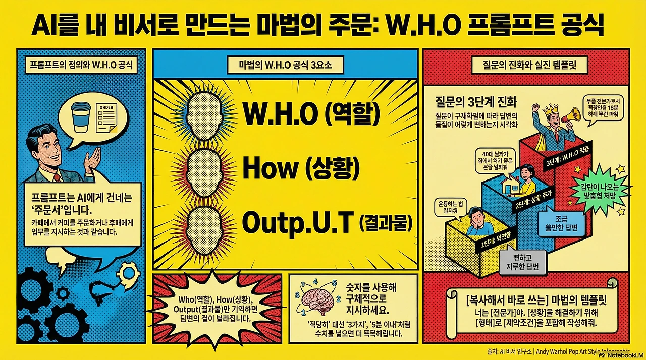 **W(Who), H(How), O(Output)**입니다. 이 공식은 AI에게 **'가면'**을 씌워주고 **'명확한 임무'**를 부여하는 가장 확실한 방법입니다.