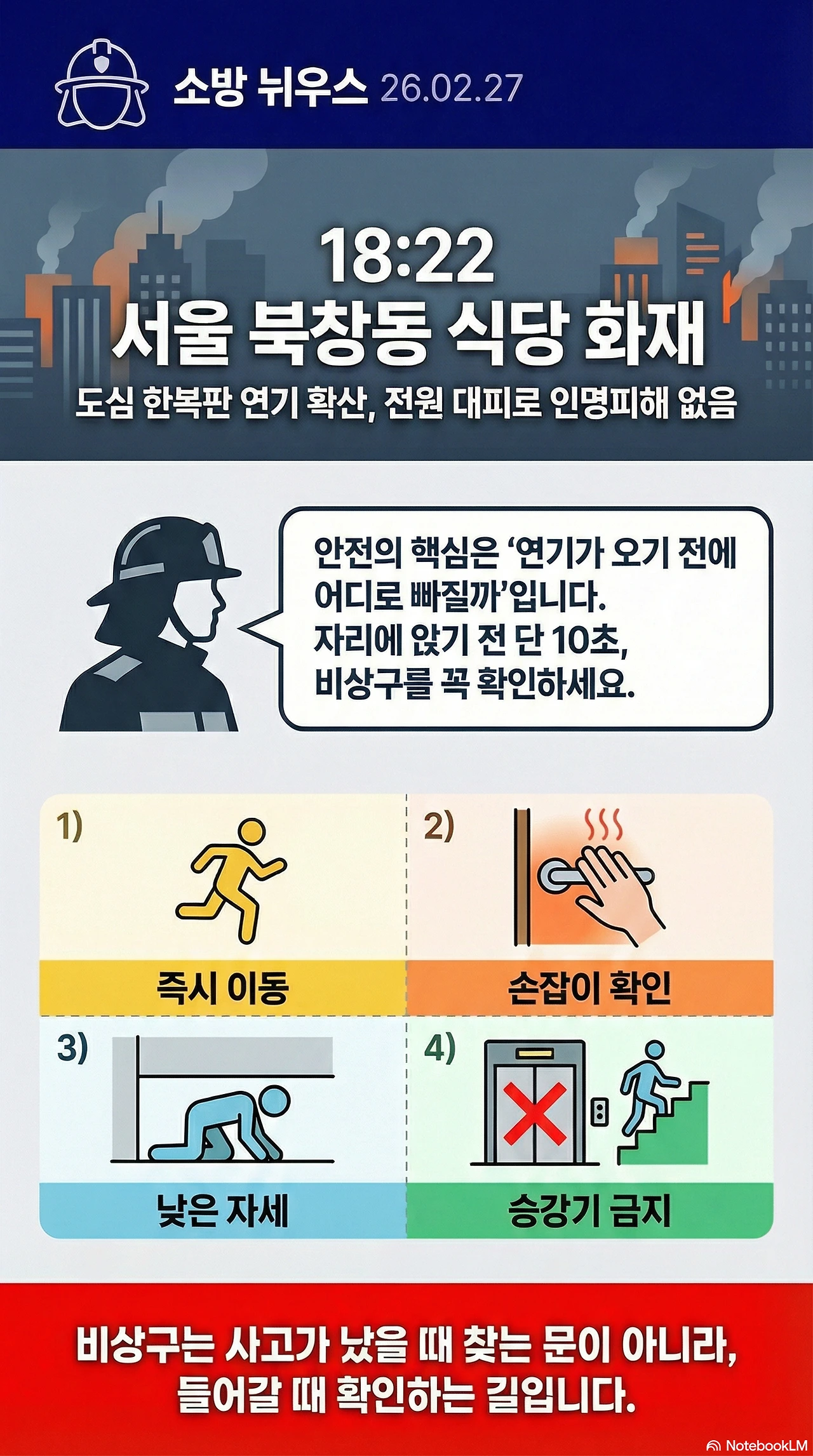 안전의 핵심은 “불이 나면 어떻게 끌까”가 아니라 “연기가 오기 전에 어디로 빠질까”이기 때문입니다.