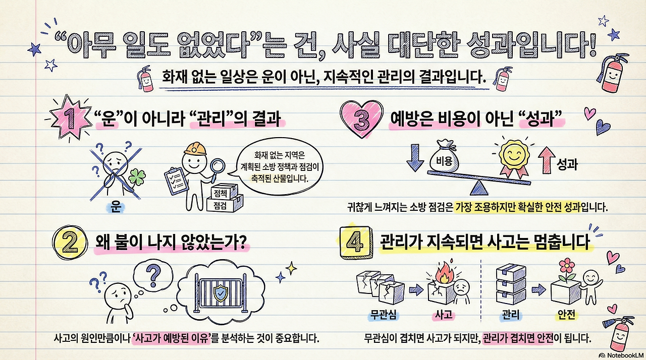 불이 난 이유뿐 아니라, 불이 나지 않았던 이유를 말할 수 있어야 한다. 그래야만 예방은 비용이 아니라, 가장 조용하지만 가장 확실한 공공의 성과로 이해될 수 있다.