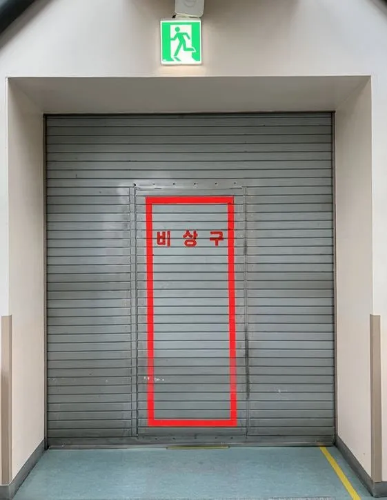 하지만 한 가지만 꼭 기억하세요! 방화셔터 위에는 항상 유도등이 설치되어 있으며, 그 아래에는 '비상구'가 마련되어 있습니다. 위험할 때 방화셔터에 가로막히면 유도등 아래를 두 손으로 힘껏 밀고 나가면 됩니다!