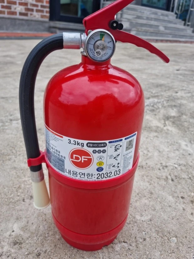 불이 난 곳에 약제를 좌우로 빗자루 쓸듯이 뿌리며 천천히 움직입니다.