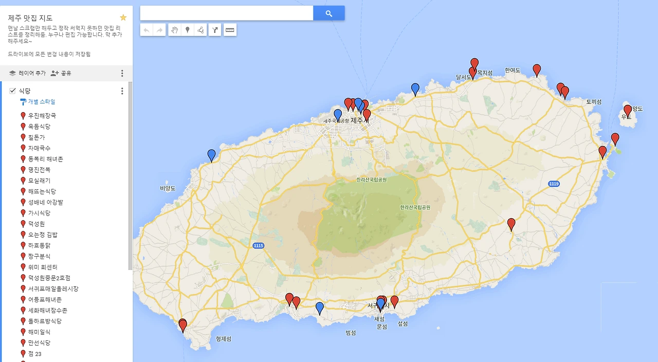 개인적으로 제주에 있다는 맛집을 구글 지도로 이렇게 정리도 해두고 있는데..; 언제 가보게 될지 요원하다.
