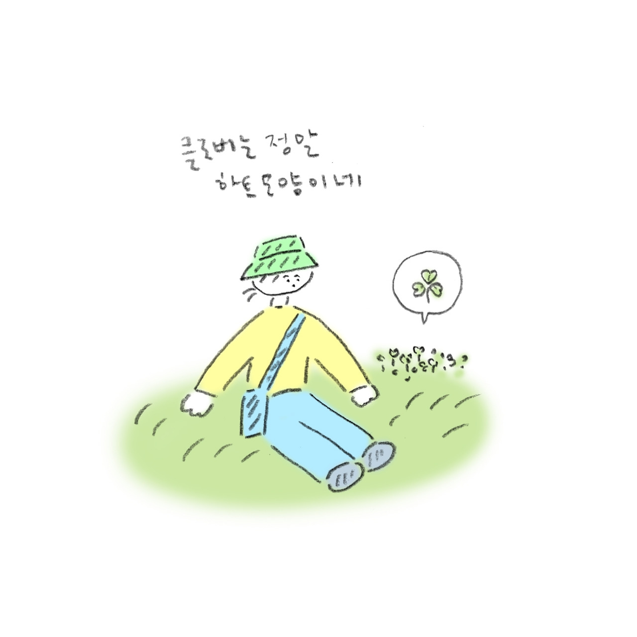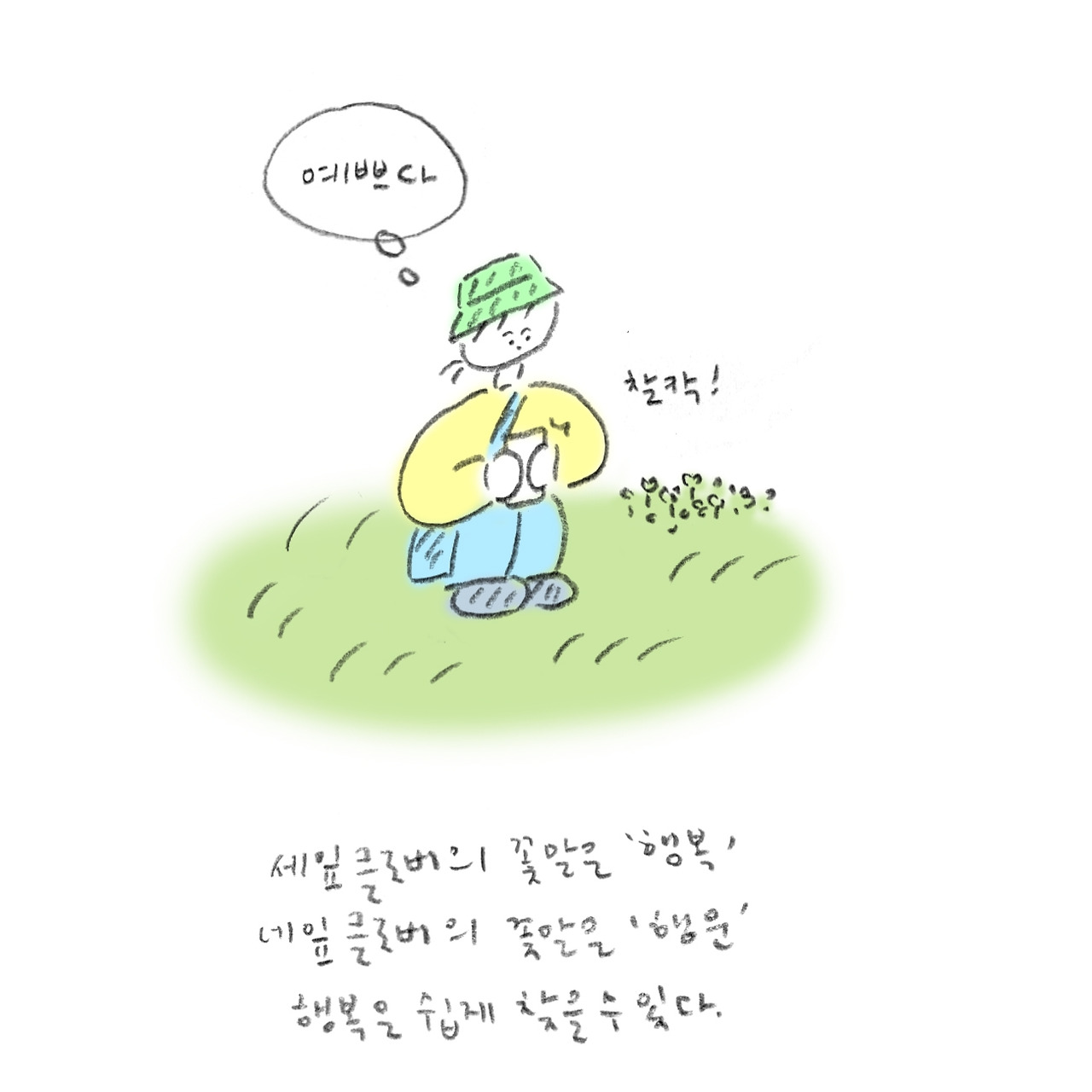 봄에 숲을 걷다 보면 계단 사이라던지 아무튼 여기저기서 자라나는 클로버를 본다. 하루는 옹기종기 모여있는 클로버의 완벽한 하트 모양 잎을 감탄하면서 보다가 꽃말을 찾아보았다. 세 잎 클로버의 꽃말은 '행복', 네 잎 클로버의 꽃말은 '행운'이라고 한다. 보기만해도 기분이 좋아지는 하트 모양 잎에 이보다 적절한 수식이 있을까.