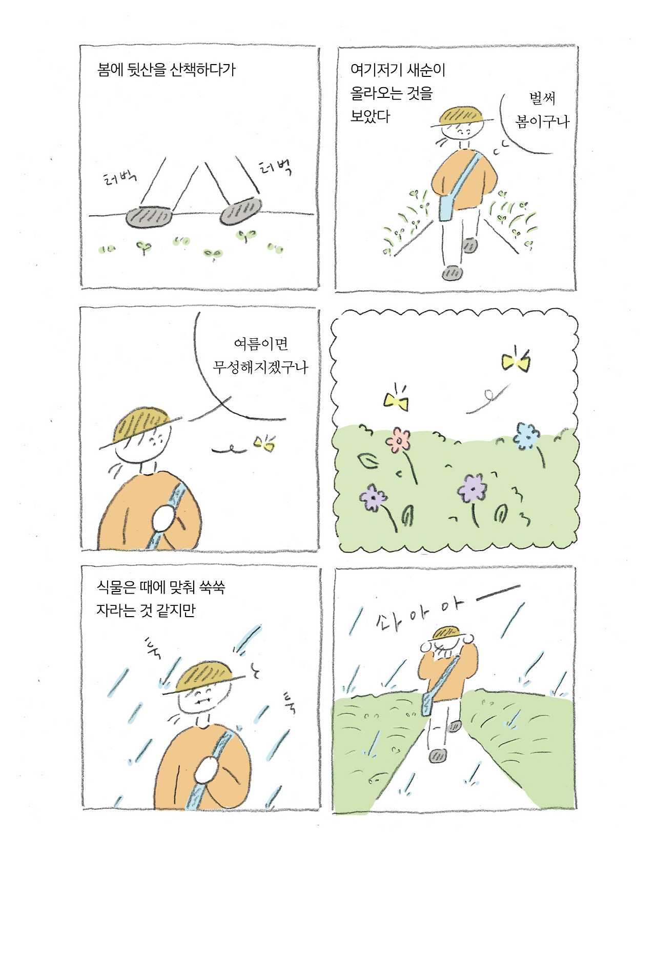 추운 겨울이 끝나고 햇살이 따스해지기 시작할 무렵부터 동네 뒷산을 매일 걸었다. 나무 그늘 밑 벤치 주변의마른 흙 사이로, 나무 계단의 틈 사이로 여기 저기 새순이 올라오는 것을 지켜보며 무심코 초록으로 무성한 여름 숲을 떠올렸다. 지난 여름의 풍경이 올해도 당연하다는 듯 말이다. 하지만 풀이 자라는 일은 당연하지 않다.