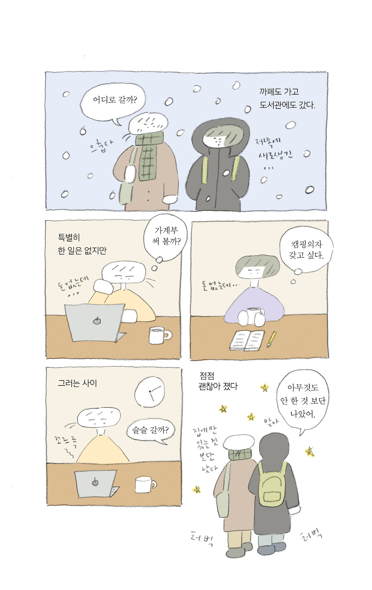 어느 해의 겨울에 비슷한 사정의 친구와 같이 매일 밖에 나가기만 했다. 해가 뜨면 밖으로 나가 날이 저물면 오늘은 뭘 먹을지 고민하며 집으로 돌아오는 길. 그저 매일 밖에 나가기만 했는데도 어느 때보다 금방 괜찮아졌다. 아무것도 안 한 것보다 조금 나은 하루를 보내는 것 만으로 충분히 괜찮을 수 있다는 걸 그제야 알게 되었다.