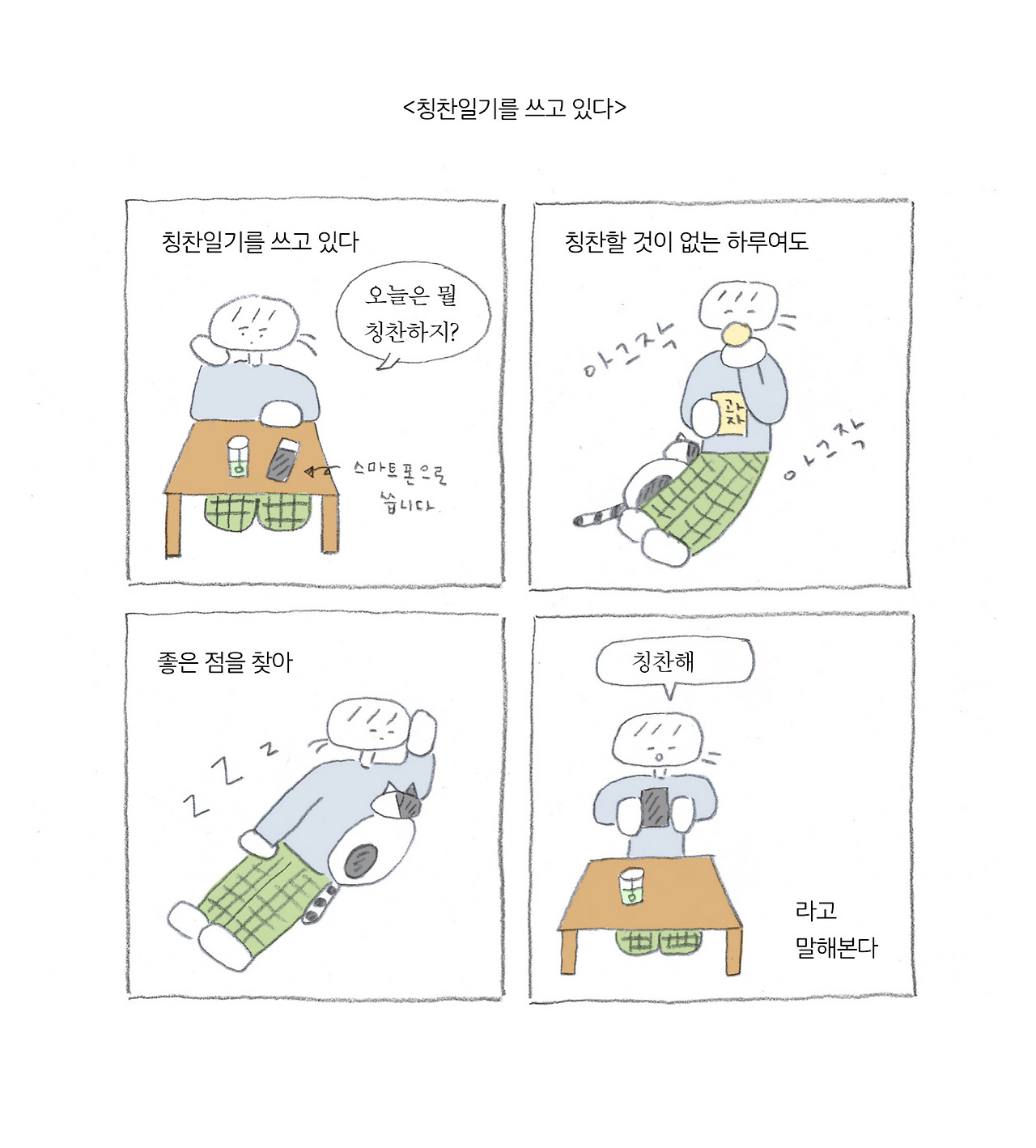 어제는 서점을 구경하다가 문구점에 들어가서 펜을 샀다. 나는 문구를 좋아하는데 특히 펜과 종이에 관심이 많다. 검은 펜은 그림을 그릴 때도 쓸모가 있으니 작업을 핑계로 더욱 자주 사는 편이다. 문구점에 들어가 한참 동안 이 펜도 써보고 저 펜도 써보고 하다가 매번 비슷한 검은 펜만 사서 나온다. 그럴 때마다 내 머리를 스치는 생각은 항상 똑같다. ‘또 검은 펜을 샀네, 작업도 잘 안 하면서.’ 하지만 칭찬 일기엔 뭐라고 써야 할까? 칭찬할 구석을 찾다 보니 습관적으로 검은 펜을 사는 나의 마음을 생각해 보게 되었다.