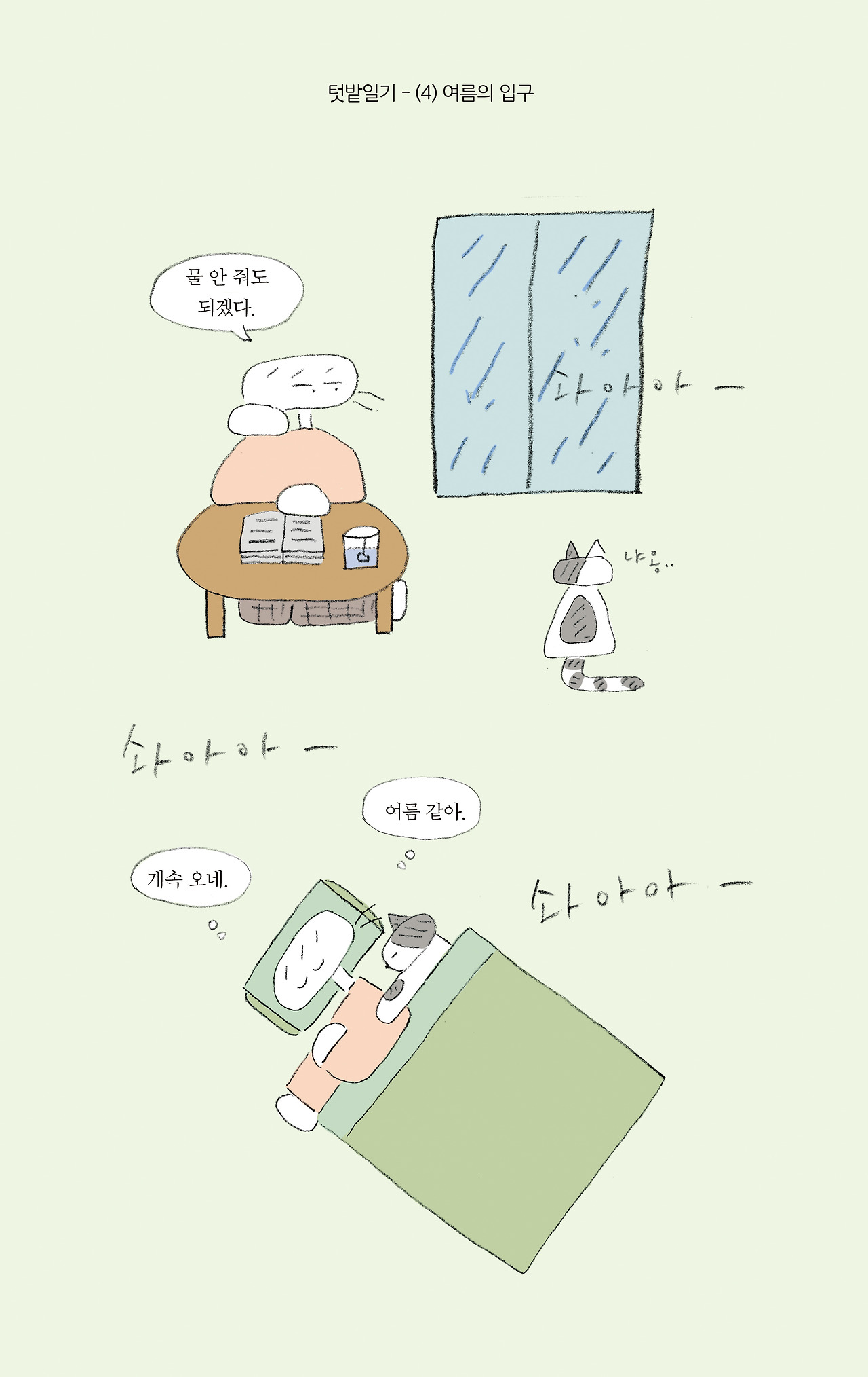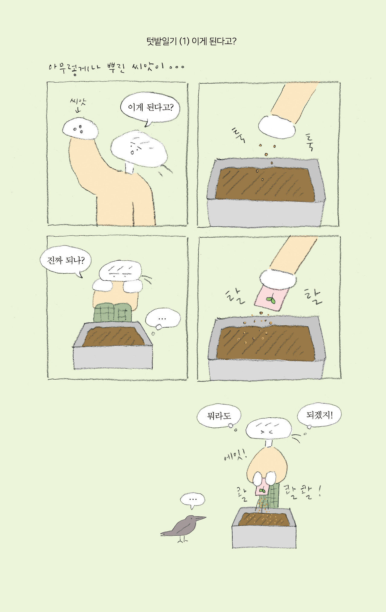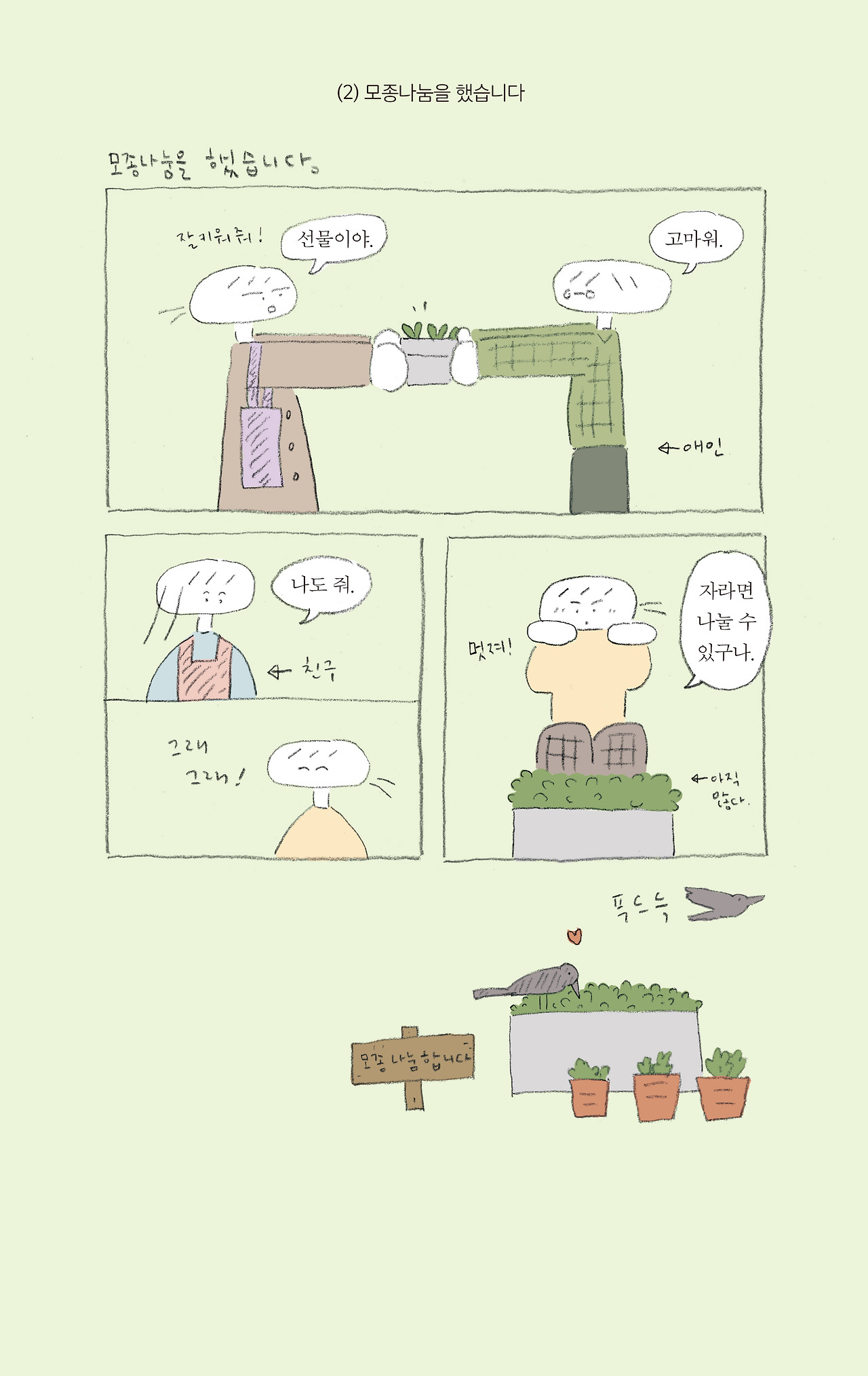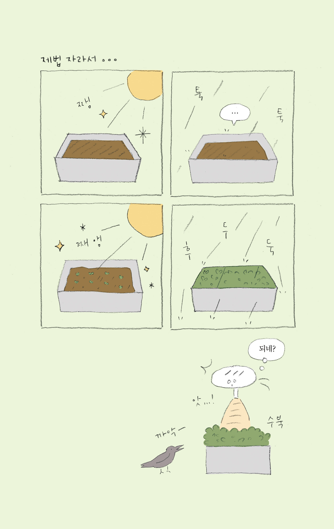 나는 사람의 얼굴을 잘 기억하지 못하는 편인데, 풀도 예외는 아니라서 처음에는 잡초와 작물을 구분하지 못했다. 이 풀이 저 풀 같고, 저 풀이 이 풀 같았다. 하지만 매일 관심을 갖고 지켜보니 내가 키우는 작물 정도는 알아보게 되었다. 다른 집 화단에 난 풀이 사실은 깻잎이었다는 걸 알고 ‘사람들은 저게 깻잎인걸 알까’ 오지랖을 부릴 정도가 되었으니 제법 뿌듯하다. 생각해 보면 예전에는 길가의 고양이도 다 같은 고양이로 보였다. 고양이를 키우면서 고양이의 무늬뿐 아니라 고양이의 얼굴과 표정 등을 세세하게 구분하게 되었듯이 텃밭을 돌보면서 식물의 얼굴을 더 잘 구분하게 되었다. 관심을 가지면 식물의 얼굴이 보인다.