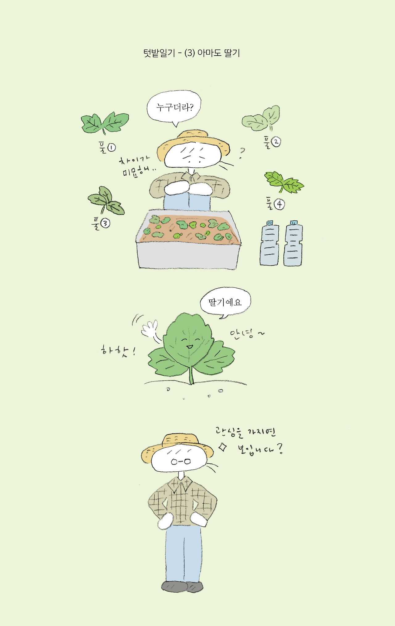 작년에 심은 딸기는 싹을 틔우지 못했는데, 올해 같은 자리에 딸기처럼 보이는 작은 잎이 올라오고 있다. 아직은 딸기인지 아닌지 알쏭달쏭하지만 아마도 딸기로 추정 중이다. 2년 만에 싹을 틔운 소중한 딸기를 위해 딸기가 아닌 풀을 뽑아주고 있다. 매일 아침 손으로 잡초를 뽑는 요즘.