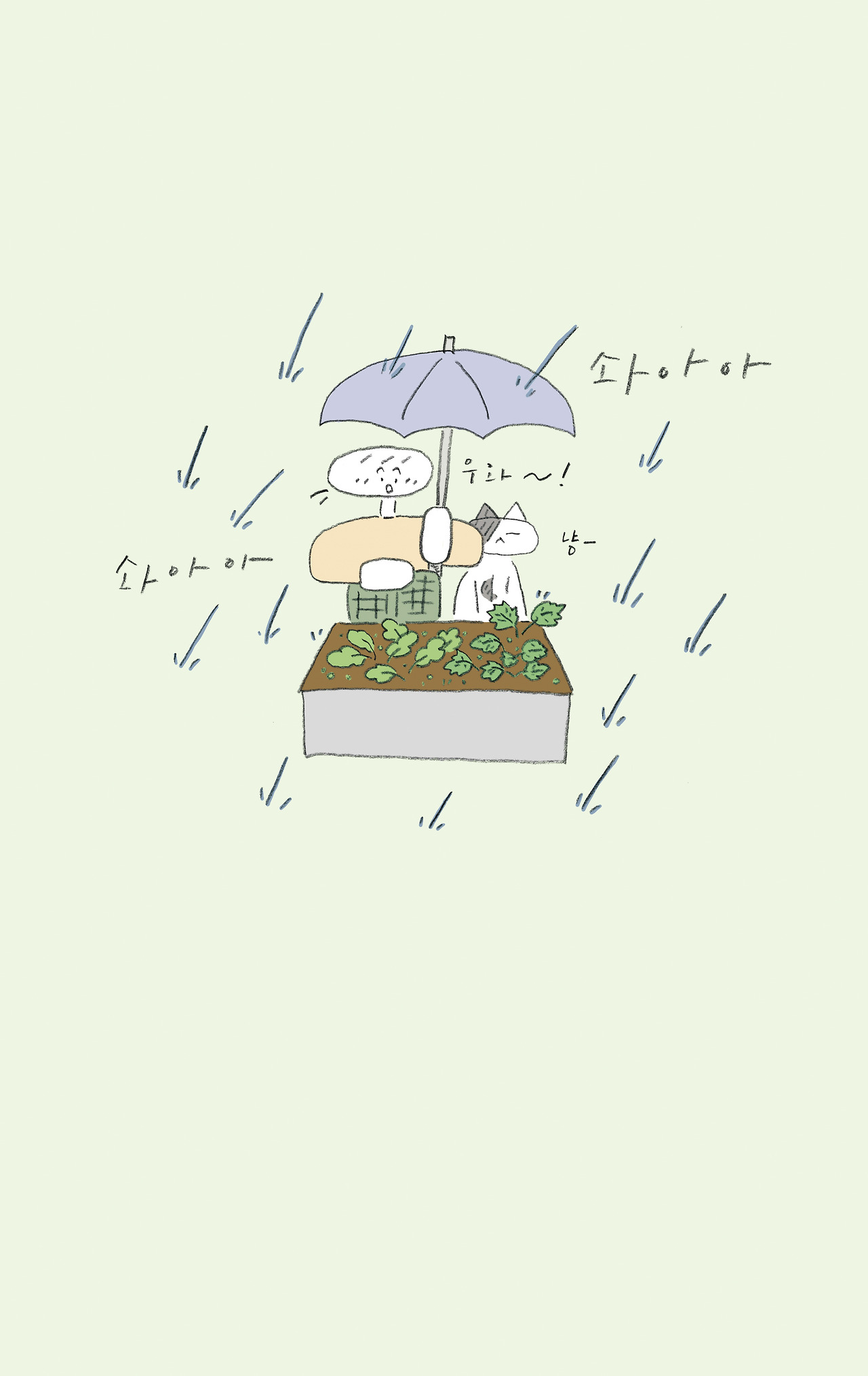 비 온 뒤, 깻잎은 깻잎 같아지고 유러피안 샐러드잎은 유러피안 샐러드잎 같아졌다. 그 모든 게 세차게 비가 온 뒤라는 사실이 새삼스럽다. 마음에 비가 내리는 날엔 나도 내가 되어가고 있는 중이라고 생각해야겠다. 비가 내릴 땐 흠뻑 비를 맞자.