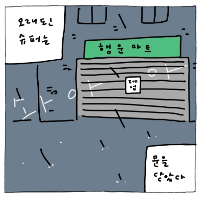동네의 랜드마크였던 슈퍼가 문을 닫은 모습은 왠지 쓸쓸. 마을버스 정류장 이름이 행운마트인데 이제 행운마트가 없는 행운마트 정류장에서 내리게 되겠네요. 가족이 하던 아주 오래돼 보이는 슈퍼였는데- 이년 전 이 곳으로 이사 온 첫 날 슈퍼에서 물건을 사면서 이 동네에 관한 이것저것을 물었던 기억이 있어요. 어떻게 지내고 계실까요, 가게를 정리하고 새로운 일상을 준비하고 계실지도요.