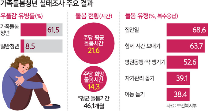 조사에 따르면, 이들의 주당 평균 돌봄시간(가사노동, 병원동행, 용변보조 등 포함)은 21.6시간, 평균 돌봄기간도 약 4년(46.1개월) 가까이 됐다. 또 가족돌봄청년의 우울감 유병률은 약 61.5%로, 가족을 돌보지 않는 청년(8.5%)의 7배를 웃돌았다. 육체적·정신적 피로감이 수치로 확인된 것이다.