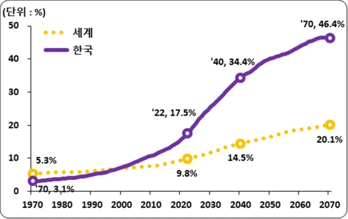 한국은 현재 세계에서 가장 늙은 나라가 되어가고 있다. 가팔라지는 고령화 흐름에 낮은 출산율 추세가 겹치면서 2005년생이 65세가 되는 2070년에는 국내 65세 이상 고령층 인구 비중이 전 세계에서 가장 높아질 것으로 전망됐다. 50년 뒤에는 생산 가능 연령대 인구보다 고령층 인구가 더 많아지며 생산연령인구 1명 당 1명 이상의 고령층을 부양해야 하는 상황이 발생할 것으로 예측됐다. 통계청 22년 자료 ‘세계와 한국의 인구현황 및 전망’에 따르면 22년 17.5% 수준인 국내 65세 이상 고령 인구 구성비는 2070년에는 전체 인구의 절반 가량인 46.4%까지 늘어날 것으로 전망됐다. 이것은 전세계에서 가장 높은 고령 인구 비중이다.