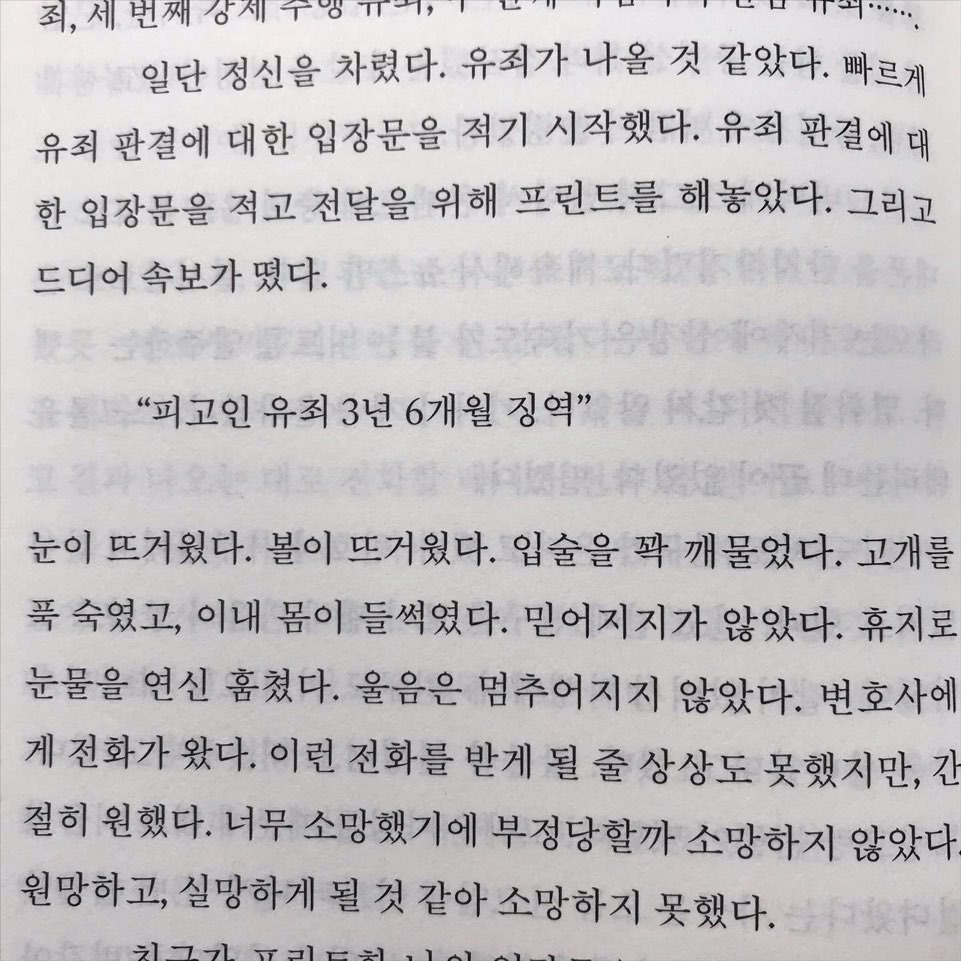 내 마음도 함께 뜨거워졌다. 결과를 알고 읽은 책이지만, 이 부분에서 얼마나 기쁘던지 가슴이 벅차올랐다. 3년 6개월도 너무 부족했다. 하지만 죄의 대가를 물을 수 있다는 것 하나만으로도 기뻤다. 아직 우리나라가 이렇다. 안희정의 유죄판결보다 그 시간을 견뎌온 김지은 씨가 장했다. 버텨주었다는 사실이 참 기뻤다.