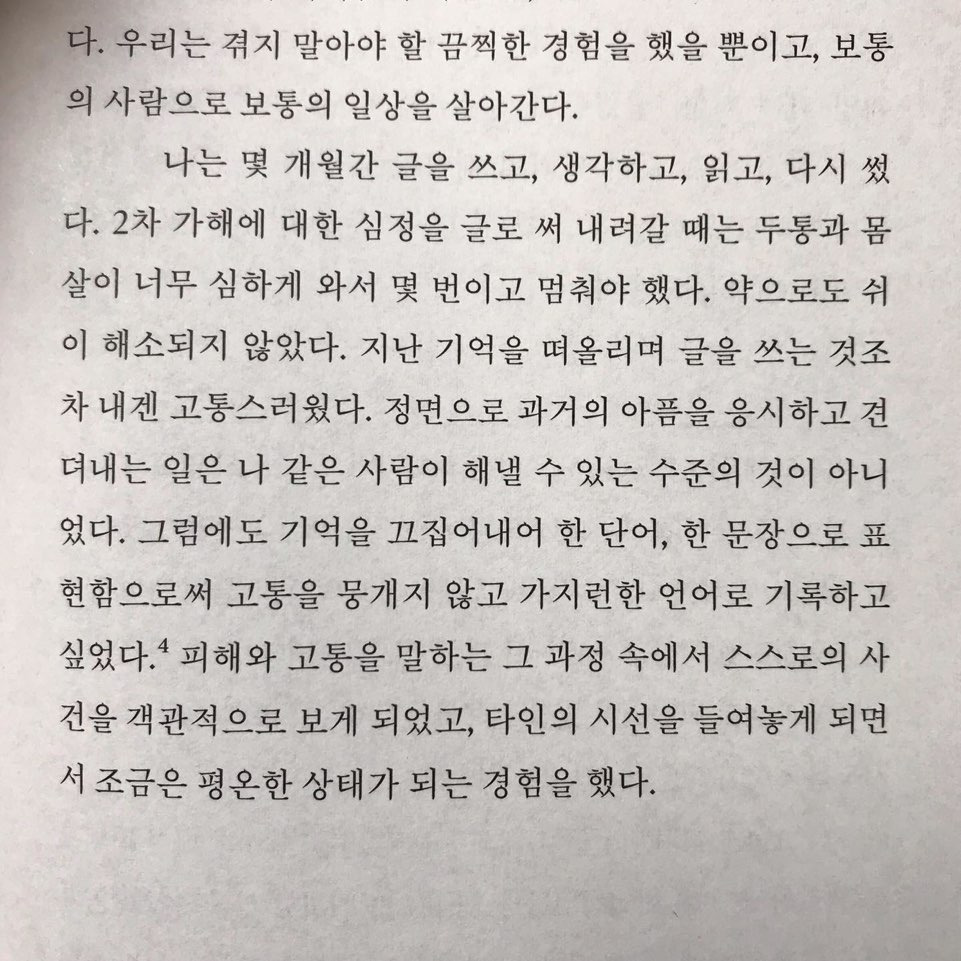 이 책을 읽으면서, 부지런히 읽고 써야 할 이유가 명확해졌다. 그간 마음이 힘든 일을 뉴스로 보면 외면해버리고 싶은 생각을 했다. 끔찍한 사건들을 보면 그저 눈을 감아버리고 싶었다. 연대한다고 말할 힘조차 없었다. 하지만, 이 책을 읽으면서는 생각이 바뀌었다. 김지은 씨는 독자들이 2년 동안의 그와 함께 할 수 있도록 마음을 열어줬다. 그의 언어는 나를 깨뜨리고 나를 울렸다. 절벽 끝에 매달린 사람들이 너무 많다. 그들을 외면하는 건 인간으로서의 도리가 아니다. 마음이 아픈 순간이 계속될지라도 나는 계속해서 여성들의 서사에 귀를 기울이기로 한다. 내가 할 수 있는 최대한의 노력을 다하여.