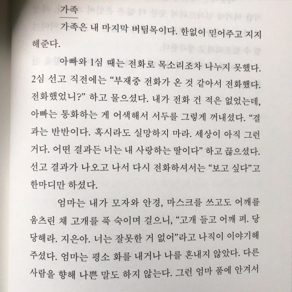 결정적으로 눈물이 났던 부분은 그의 가족에 대해 이야기한 부분이었다. 김지은 씨는 가족들과 떨어져 혼자 지내며 재판을 준비했다. 여러 가지 이유가 있었겠지만, 사건을 마주하면서 힘에 부친 자신의 모습을 가족들에게 보여주고 싶지 않았으리라 짐작한다. 안희정에 대한 재판이 있던 날. 곧 안희정 유죄가 확정되는 날. 김지은 씨는 그의 부모로부터 이런 전화를 받았다.