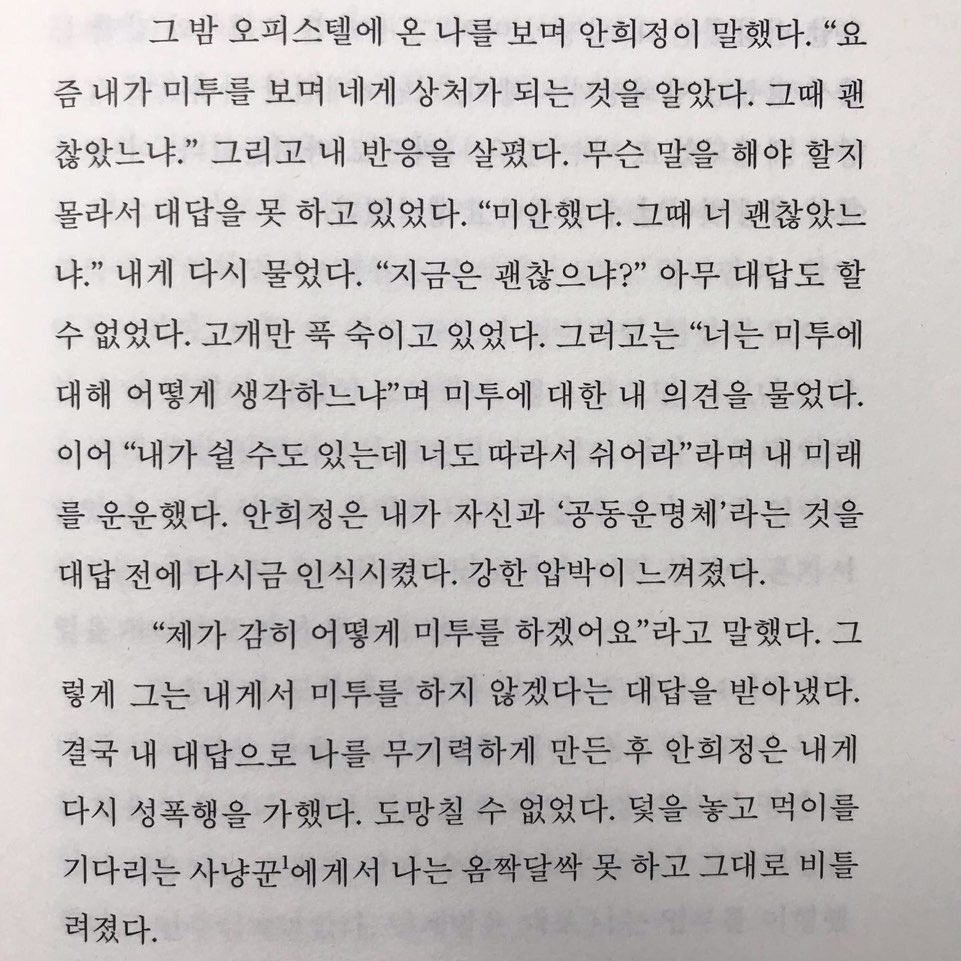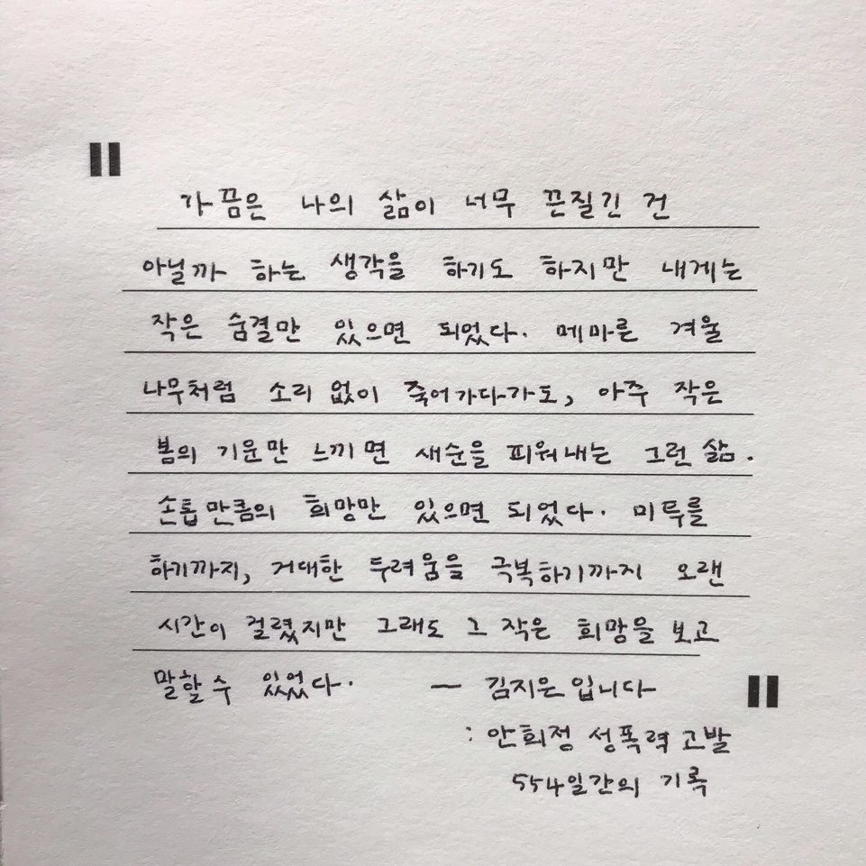 김지은 씨는 그에게 응원을 보내온 사람들을 일일이 열거했다. 내가 기억해보더라도 안희정이 유죄 판결을 받기까지 대한민국 여성들의 연대는 끈끈했다. #metoo와 #withyou 내가 할 수 있는 것이라고는 이것밖에 없었다. 그러나 마음만은 함께였다. 최전방에 서서 피해자들을 돕는 사람들에게 존경과 경의를 표한다.