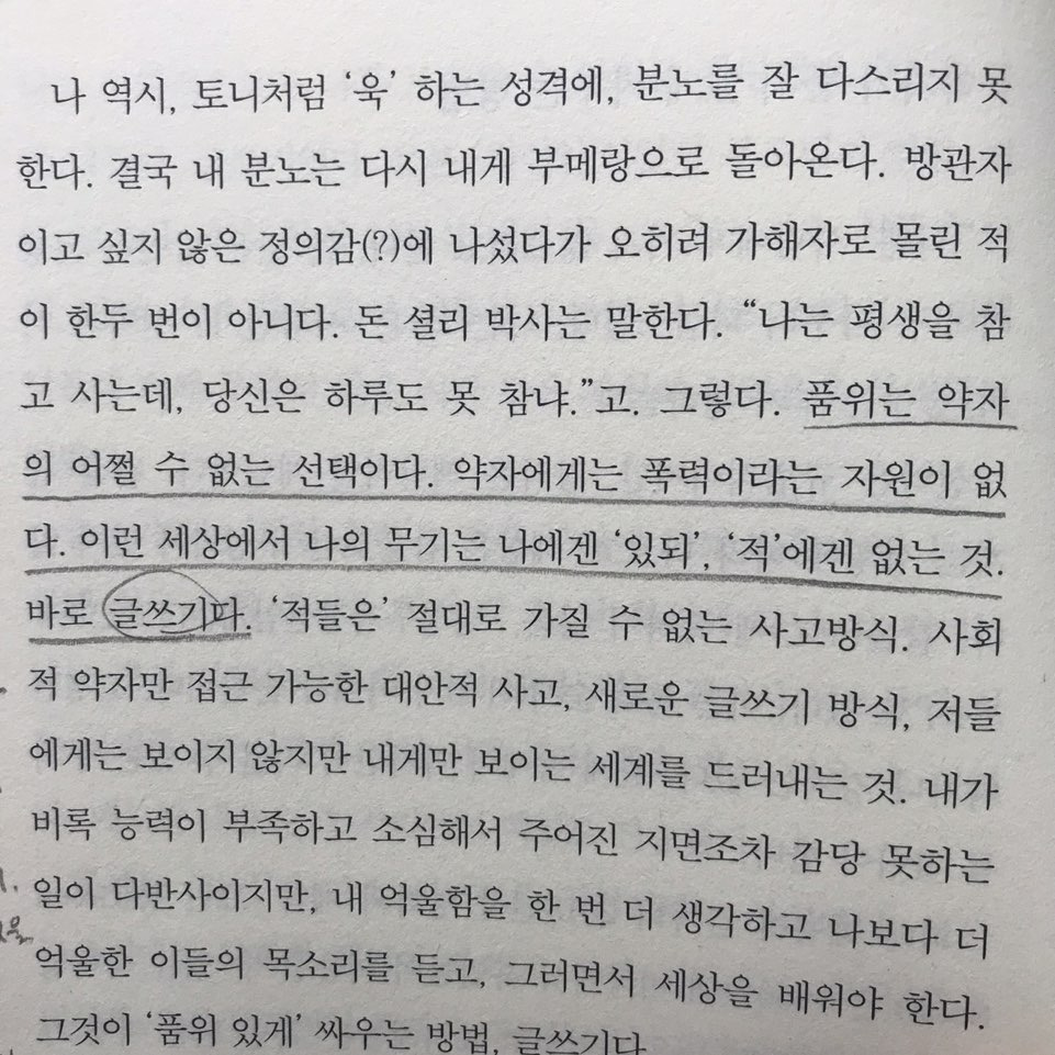 1. 정희진 선생님은 품위 있게 싸우기 위해 글을 쓴다. 약자들은 폭력이라는 자원이 없다. 남들은 없되 그에겐 있는 것, 그것이 글쓰기다. "'적들은' 절대로 가질 수 없는 사고방식. 사회적 약자만 접근 가능한 대안적 사고. 새로운 글쓰기 방식. 저들에게는 보이지 않지만 내게만 보이는 세계를 드러내는 것." 대학 때 존경하던 교수님이 그런 말씀을 하셨었다. '내가 너희들에게 조언하는 단 한 가지가 있다면, 품위를 잃지 말라는 거다'. 그 말이 겹쳐진다.