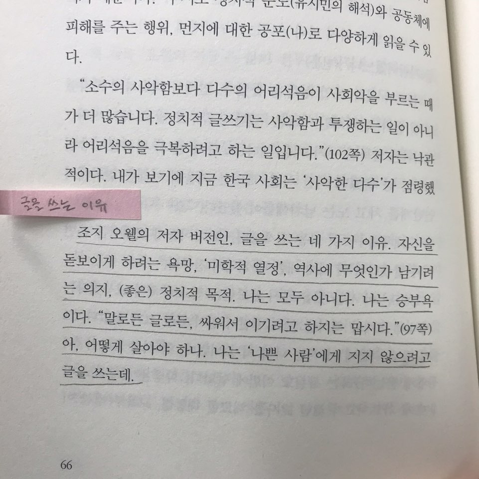 나는 책을 다 읽고 나면 마음에 가장 와 닿았던 한 줄을 꼽아 인스타그램에 업로드하는데, 이 책은 한 줄을 고를 수가 없었다. 소설이나 에세이류는 비교적 마음에 드는 한 구절이 눈에 잘 보이는 편인데, 이런 책의 경우 한 줄을 선택하기가 쉽지 않다. 게다가 내가 정희진 선생님 책에서 한 줄을 고르다니. 정말 어려운 일이다. 그럼에도 감상평을 쓰려고 이렇게 책을 들췄으니 이 책의 '메인'격인 문장을 소개할까 한다. 정희진 선생님이 이 책을 내신 이유. 그가 계속해서 글을 쓰는 이유. 그 철학이 담긴 문장이다.