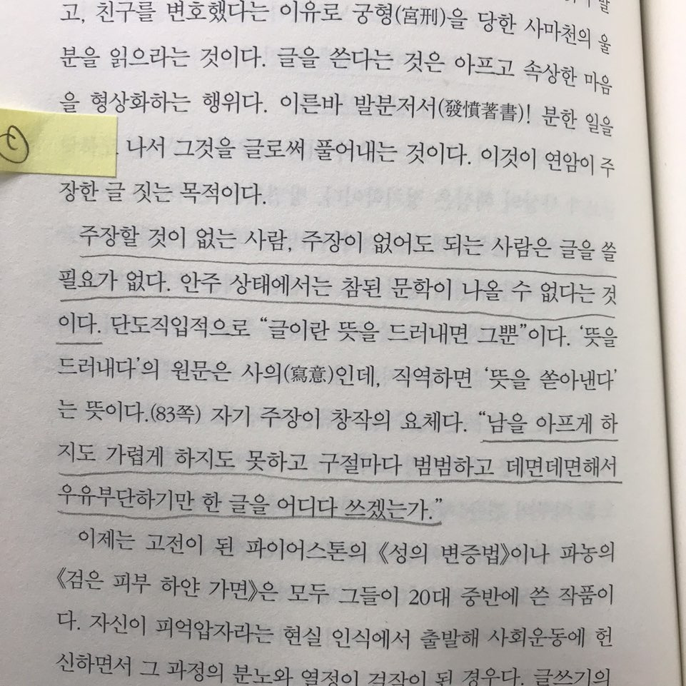 2. 박수민의 <연암 박지원이 글 짓는 법>을 발췌한 부분이다. "남을 아프게 하지도 가렵게 하지도 못하고 구절마다 범범하고 데면데면해서 우유부단하기만 한 글을 어디다 쓰겠는가" 글의 목적성을 뚜렷하게 드러낸 문장이다. 모든 글은 사람에게 닿기를 욕망한다. 영향력을 행사하는 글. 그것이 모든 글쓴이들의 바람이 아닐까.