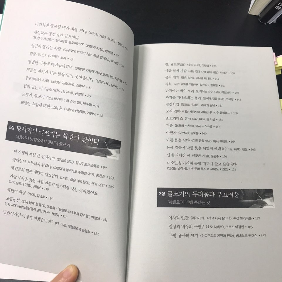 정희진 선생님의 신간이 나왔다는 이야기를 듣고 인터넷으로 주문했다. 정희진의 글쓰기 1,2 세트로 나왔다고 해서 두 권을 함께 주문하고 싶었지만 주머니 사정이 좋지 않았다. 1권을 읽고 좋으면 2권을 사려고 했었는데 그냥 잔말 말고 두 권을 같이 시켰어야 했었다. 아. 기대를 안고 책을 주문했는데, 어쩜 기대한 것 이상으로 좋았다. 인스타그램에도 썼지만 정희진 선생님의 글을 볼 수 있는 세대여서 감사하다. 일단 책의 표지나 디자인은 정말 마음에 들었다. 무언가 쓰는 여성의 모습이 제목과 어우러졌다. 나는 책 뒷면을 보면 책을 미리 들춰보는 것 같아서 최대한 아꼈다가 보는 편이다. 책을 웬만큼 읽은 뒤, 내가 뽑은 몇 줄과 뒤 소개 글이 맞닿아 있는 게 그렇게 기분이 좋을 수가 없기 때문이다. 이번에도 기분이 좋았다. 내가 줄을 치고 사진을 찍고 난리를 친 문장이 뒤에 그대로 실려 있었다. 그 문장은 아래에서 소개하겠다.