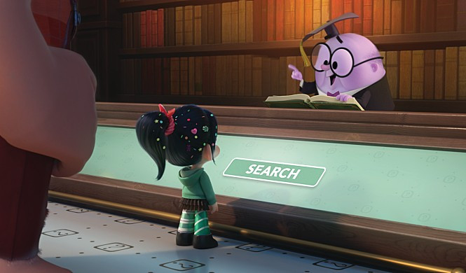 수많은 사람들이 인터넷을 이용하는 모습, 우리가 현실에서 사용하는 SNS에 대한 묘사는 정말 훌륭합니다. 랄프가 우뚝 서있는 구글 빌딩을 보며 ‘고글을 살 때는 저기로 가면 되겠다.’고 말하는 장면은 깨알 같은 웃음을 줍니다. 또한 검색엔진인 노스모어에서 일하는 캐릭터로 자동완성 기능을 표현한 장면은 이 영화의 디테일과 유머를 대표하기에 부족함이 없습니다.