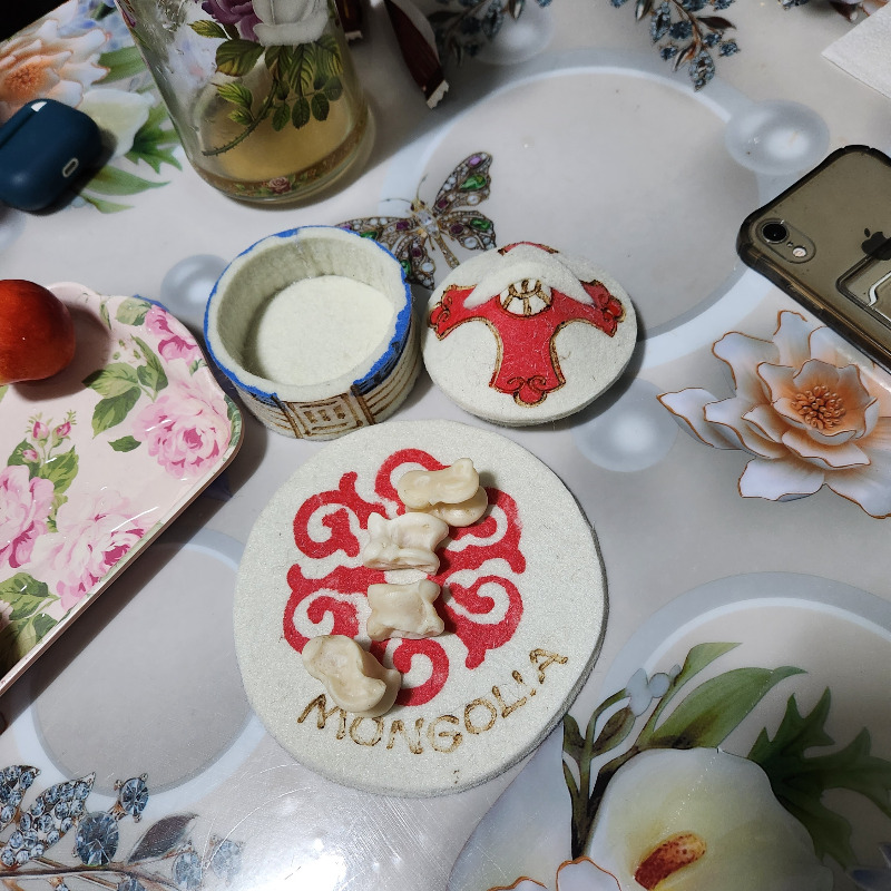 집으로 복귀하여 간단히 몽골 디저트를 먹고 난 후 고맙게도 선물을 받았다. 몽골전통보드게임인 '샤가이'였다. 양의 복숭아뼈로 만든 이 조각은 던졌을 때 4가지의 형태로 나오는데 그 형태에 따라 몽골의 대표가축들인 말, 낙타, 염 소, 양 이렇게 정해진다. 왼쪽부터 낙타, 양, 염소, 말 이러한 순서로 모양이 나온 것이다. 복숭아뼈 사이드면 중 움푹 파인곳은 낙타, 안 파인 매끄러운 반대쪽면은 말이고 위 아랫면 중에서 둥그런 면은 양, 반대로 염소뿔같이 생긴 면은 염소... 아무튼 이러한 식으로 다양한 게임을 할 수가 있다고 한다.