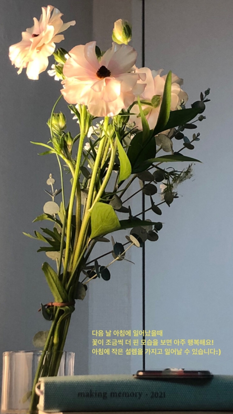 이렇게 조심히 안아 데려온 나의 행복들은 예쁜 화병에 담아, 침대 옆 협탁에 잘 보이도록 올려둔다. 내일 아침 눈을 뜨면 바로 보일 수 있도록 말이다. 아직은 작은 꽃 봉오리에 불과하지만, 내일 아침이 되면 이 꽃들은 내 행복이 되어 활짝 피어날 것이다. 일요일의 시간이 흘러갈수록 하나씩 활짝 펴가는 꽃 봉오리들은 일요일의 흘러가는 시간들을 아쉽지 않도록 도와준다. 토요일의 내가 준비한 내일의 나를 위해 작고 소소한 선물이다.