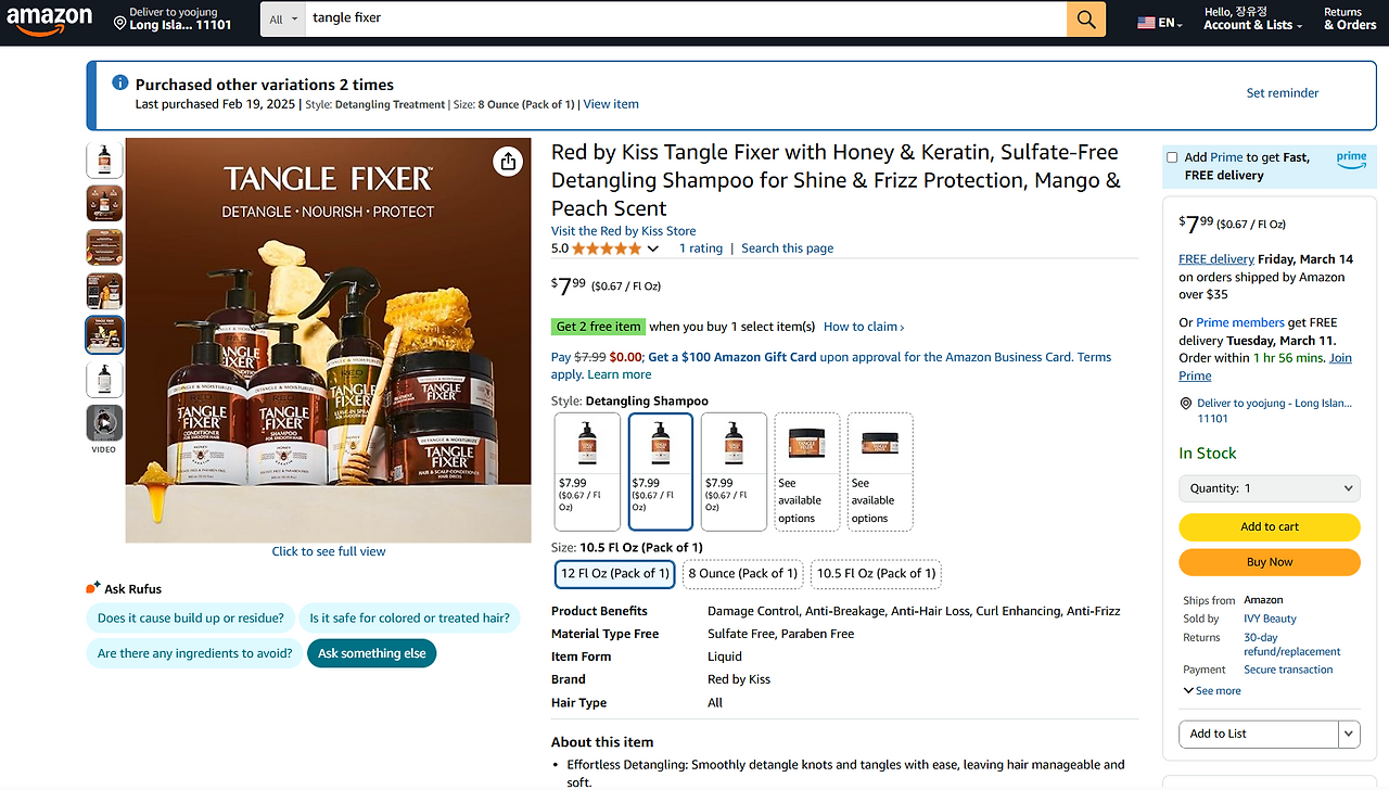 미국에 온 지 2년, 올해 1월에 5번째 프로젝트였던 Tangle Fixer라는 헤어케어 라인을 론칭했는데 방금 아마존 온라인에 포스팅되었다. 워낙 경쟁이 치열한 시장이기 때문에, 후기가 정말 중요하고 또 가격 경쟁력도 중요하지만 이번 프로젝트 제품은 많이 팔렸으면 좋겠다(참고로 작년에 론칭한 제품들은 한 프로젝트당 아마존에서만 약 10만 불의 수익이 났다).