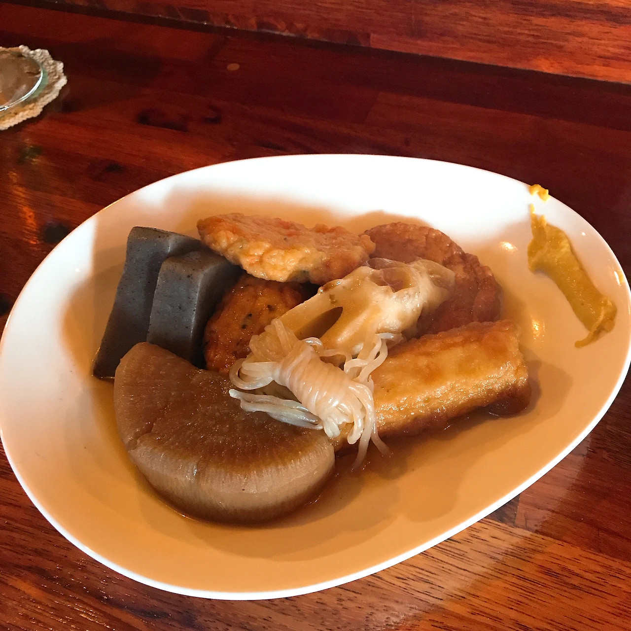 먹을 수 있는 안주는 대략 10개. 그날 그날 재료 수급 상황에 따라 달라지는 것 같았다. 어제 만화방에서 읽은 심야식당에 나온 바지락 술찜과 명란구이를 시켜봤다. 안주가 나올 때까지 시간이 좀 걸릴 것 같아서 오뎅 세트도 시켰다. 오뎅과 무, 곤약이 먹음직스러워 보였고 실제로도 그랬다. 무가 아주 푹 익어 맛있었는데 이틀을 끓여 그렇다고 했다. 역시 맛있는 건 평범하지 않은 시간이 필요하다고 생각했다.