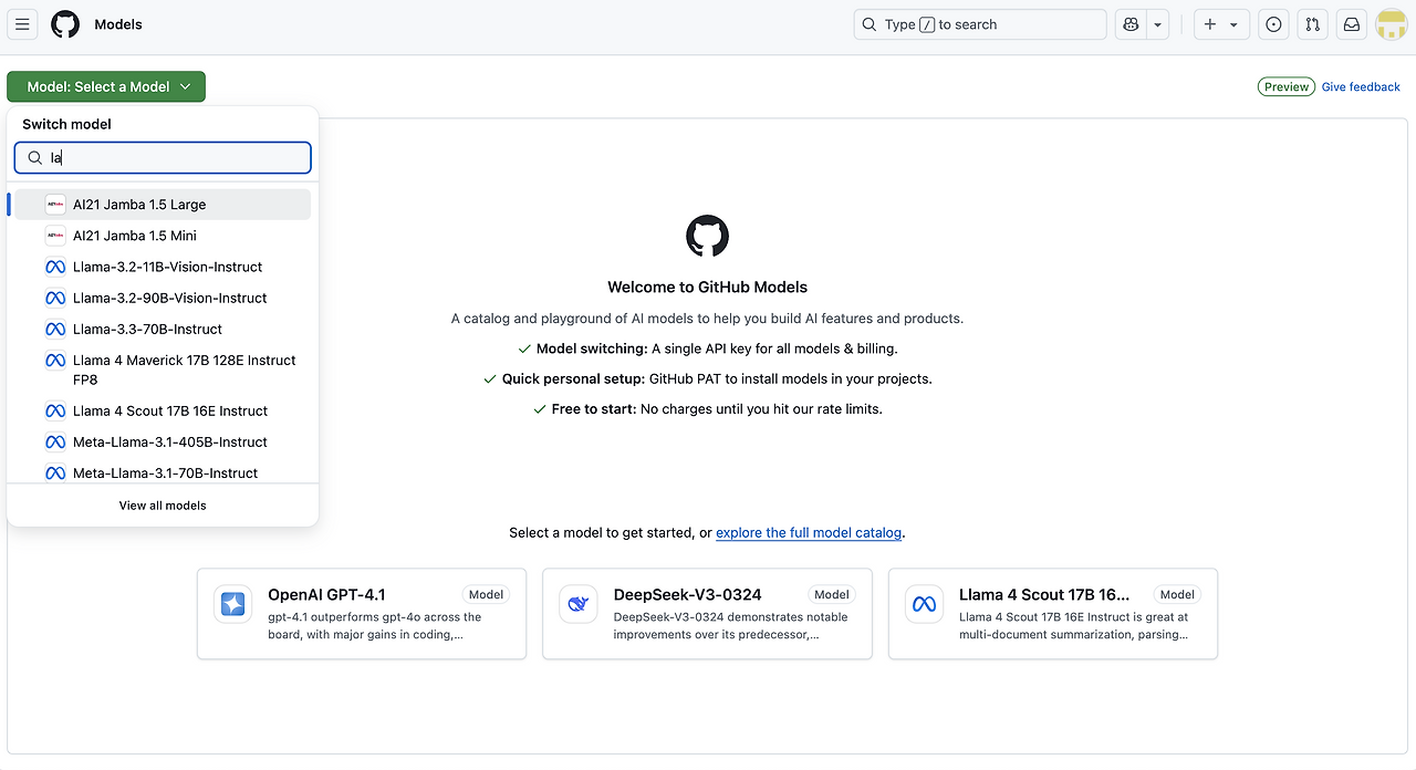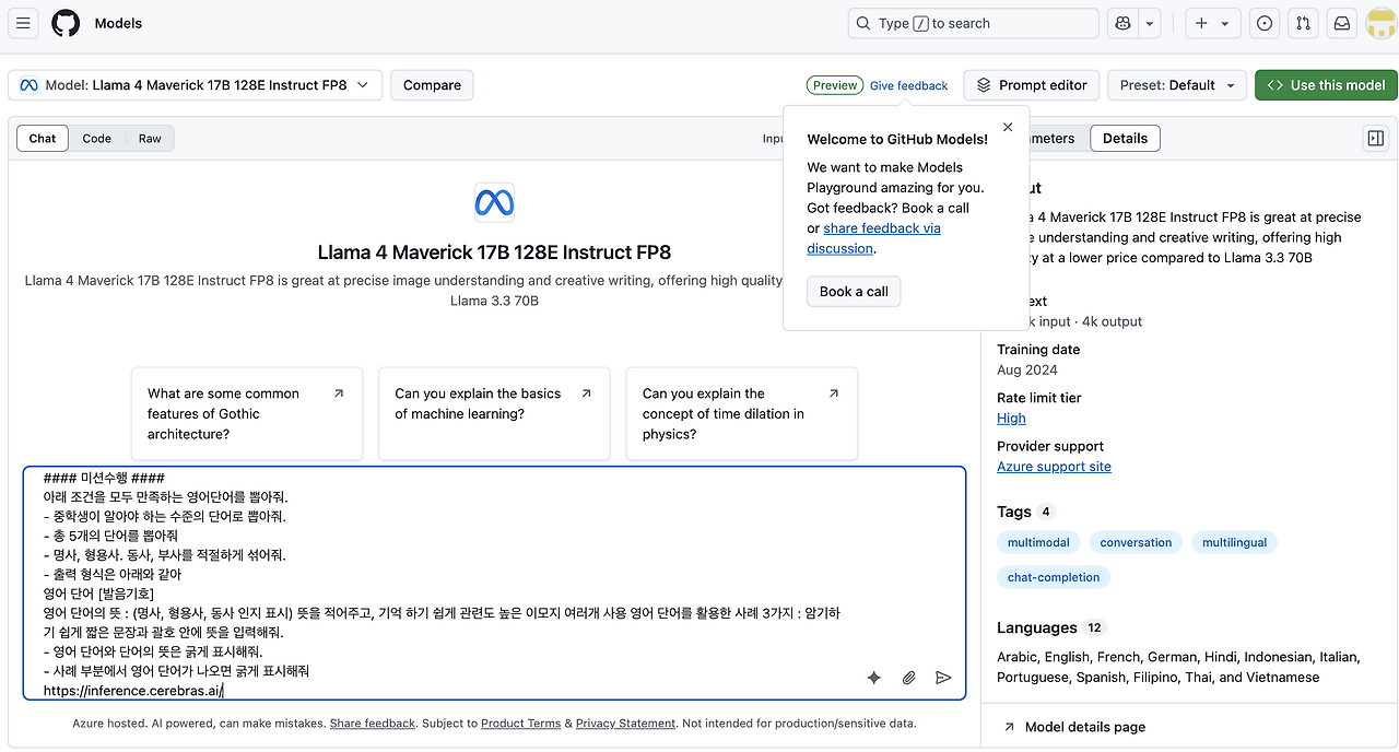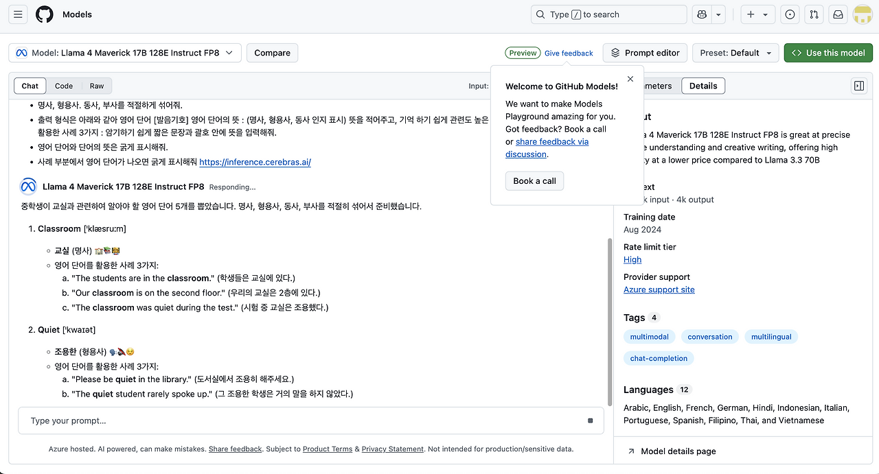 2. 깃허브 마켓플레이스 모델스 (GitHub Marketplace Models)도 활용할 수 있습니다!