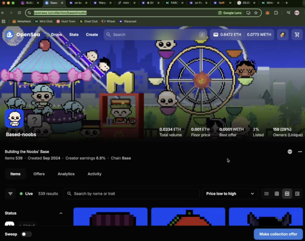Based Noops 프로젝트는 뉴비들이 만든 프로젝트라고 합니다. 프로젝트의 정체성과 테마를 정하고 독창적인 아이디어를 도출하고, 디지털 아트를 제작하고, 각 NFT에 고유한 속성(색상, 배경, 액세서리 등)을 부여했다고 해요.