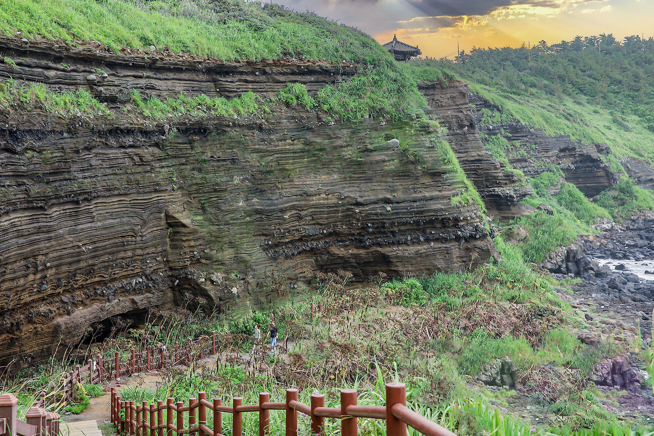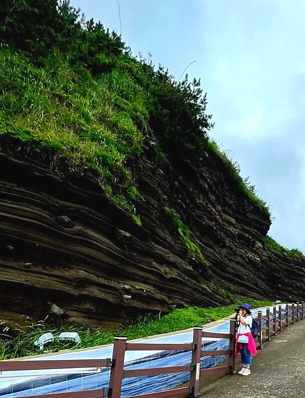 차로 이동해서 수월봉 지질 트레일로 가서 보았다. 제주에 14만 년 전 화산폭발과 몹시 부는 바람이 바위에 줄처럼 길을 만들었다. 화산 퇴적구조로 신기하고 정교한 조각 같았다. 바위 지질트레일 높이가 100m는 안될 듯 보였다. 영알길, 당산봉, 차귀도 전체의 길이는 약 10km라고 했다.
