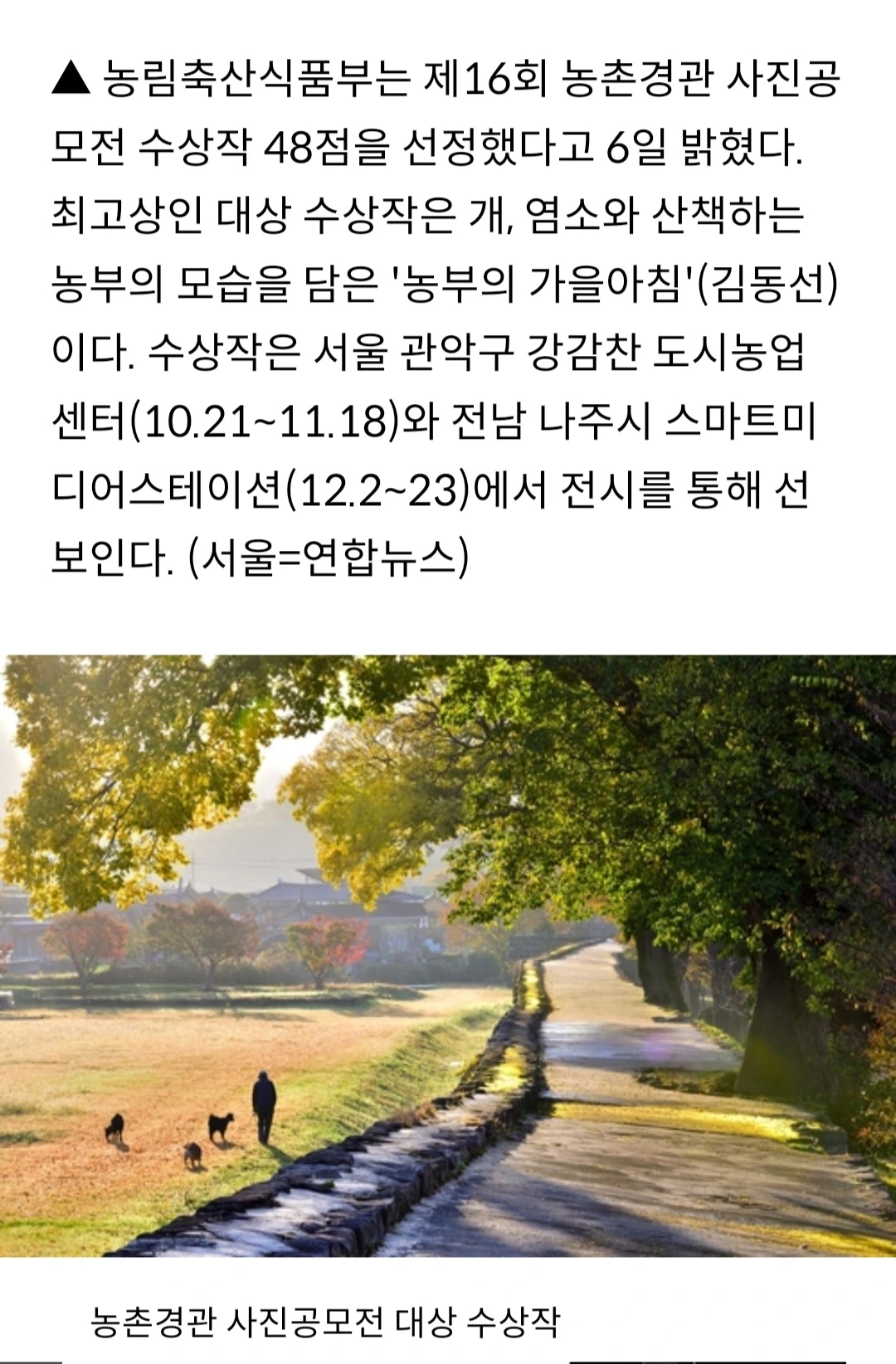 농촌경관 사진공모전 대상 수상작을 인터넷으로 보며 자연스러움, 빛을 활용, 사람과 동물을 주제로 활용한 듯한 모습등을 보며 그만 감동을 받고 말았다. 나도 "이야기가 묻어나는 사진 작품을 만들어야겠다"라고 되뇌었다. 일단 작은 목표를 세웠지만 좀처럼 쉽게 사진 작품이 되는 건 아니었다.