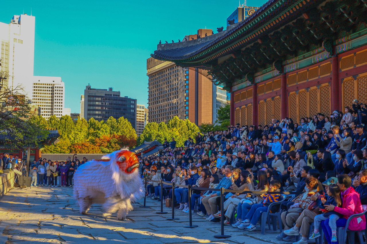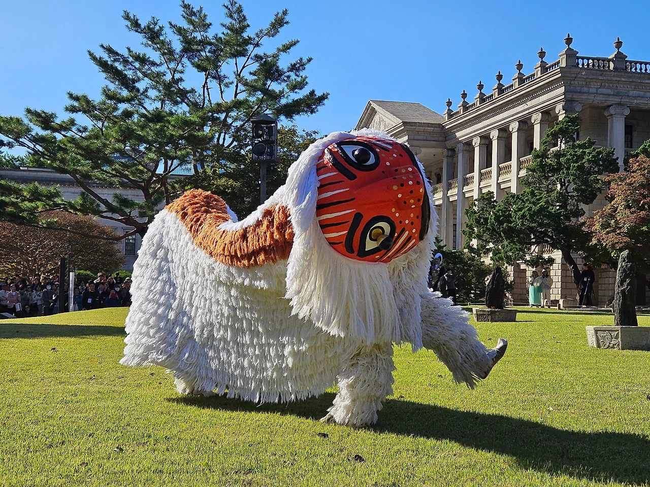 관람객들이 잔디무대 앞에 높은 계단에 정리하여 앉아서 사자춤을 보면서 행복해하는 모습이 보였다. 사자의 탈속에 한 마리당 2 사람이 들어간 듯 보였고, 그 두 마리의 사자를 지휘하던 분이 광대 한복에 탈을 쓴 모습이었는데 고전적인 춤 동작이 예사롭지 않으신 듯 보였다. 모던스타일이 아닌 그런 모습을 요즈음 뭐든지 검색만으로 해결되는 줄 아는 십 대들도 많이 보아야 할 것 같았다. 3~4살 아이들을 동반한 많은 젊은 분들도 보였다.