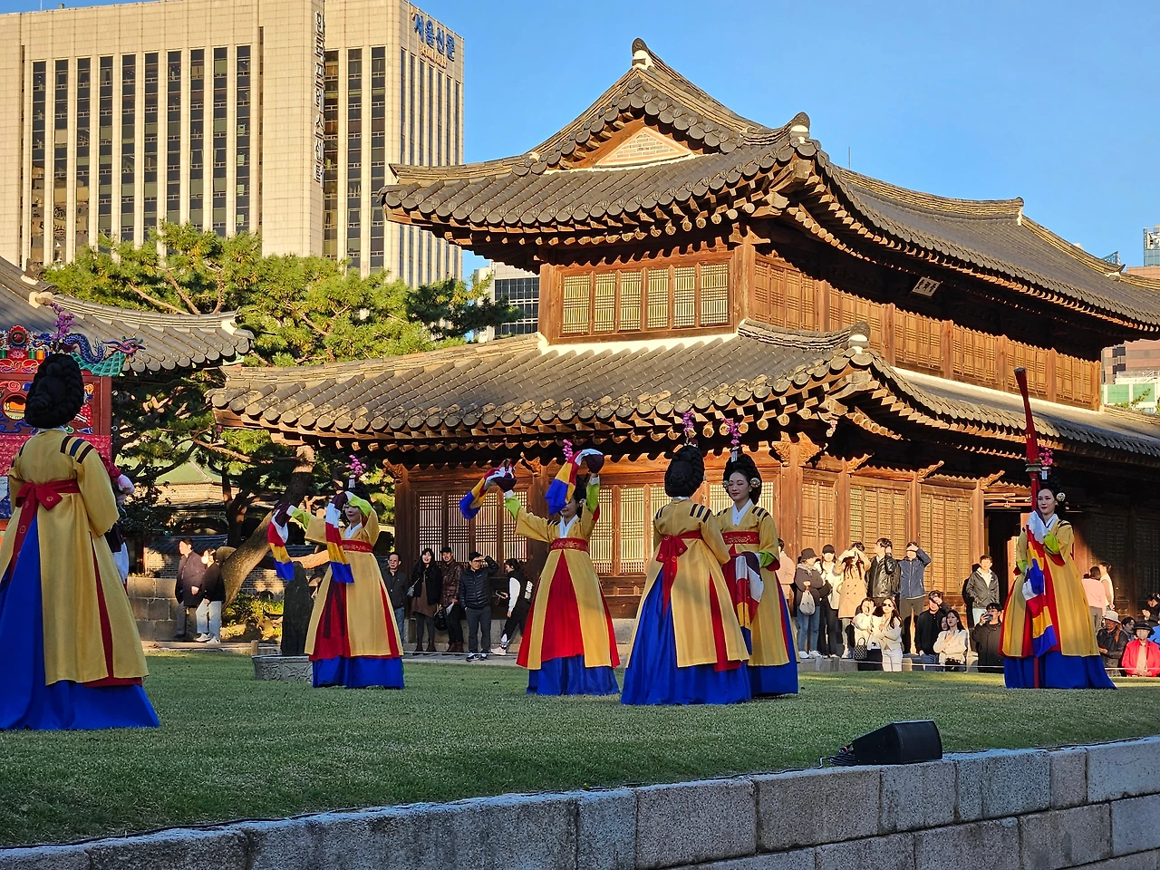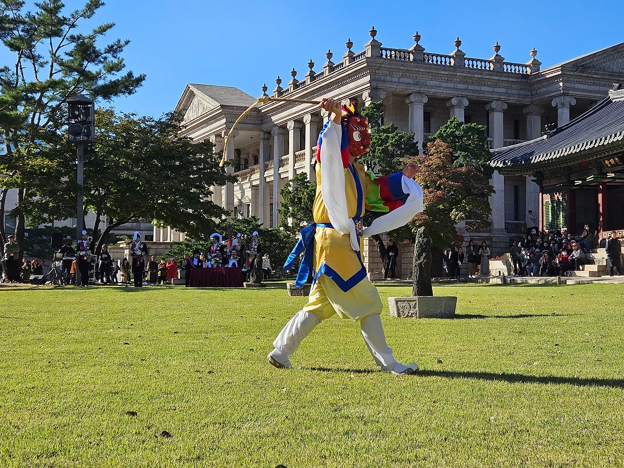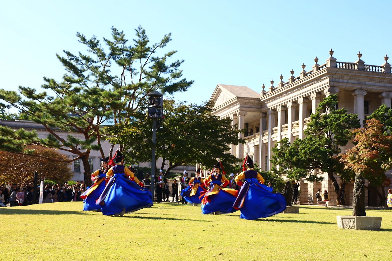 고전적인 한복의 선은 더할 나위 없이 아름답고 색깔은 매혹적이었다. 양손 끝에 흰색, 빨간색, 노란색, 남색줄무늬 천을 끼우고 손에는 스틱 같은 것을 들고 추는 화관무 같은 춤도 보였고, 양손에 들고 칼춤을 추던 모습도 보였다. 정말 아름다운 춤사위와 한복이 좋은 계절과 잘 어울렸다. 고전춤을 아주 잘 추는 모습에 관람객들도 흠뻑 취한 듯 보였다. 실외의 햇빛에서 춤추는 동작들 움직임을 카메라에 담기는 했는데, 사진은 찍는 위치도 어디에서 찍느냐에 따라서 멋진 장면이 되기도 안되기도 했다.
