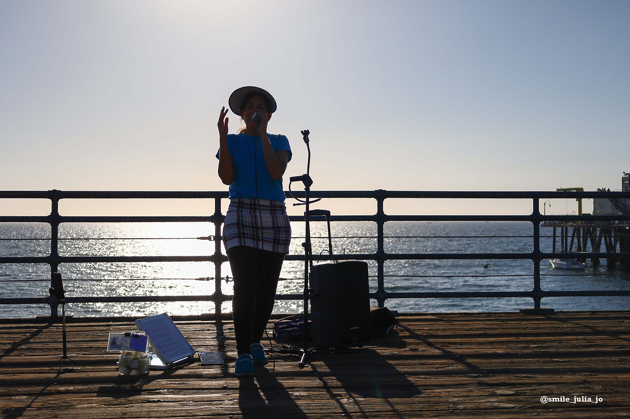 그래도 산타모니카 긴 해변까지 걸어서 가보았다. 금요일 오후이라서일까 정말 많은 사람들이 여기저기에서 놀고... 놀이기구도 타고 있었다. 노래를 잘 부르는 버스킹 가수를 보고 사진을 찍기도 했다.