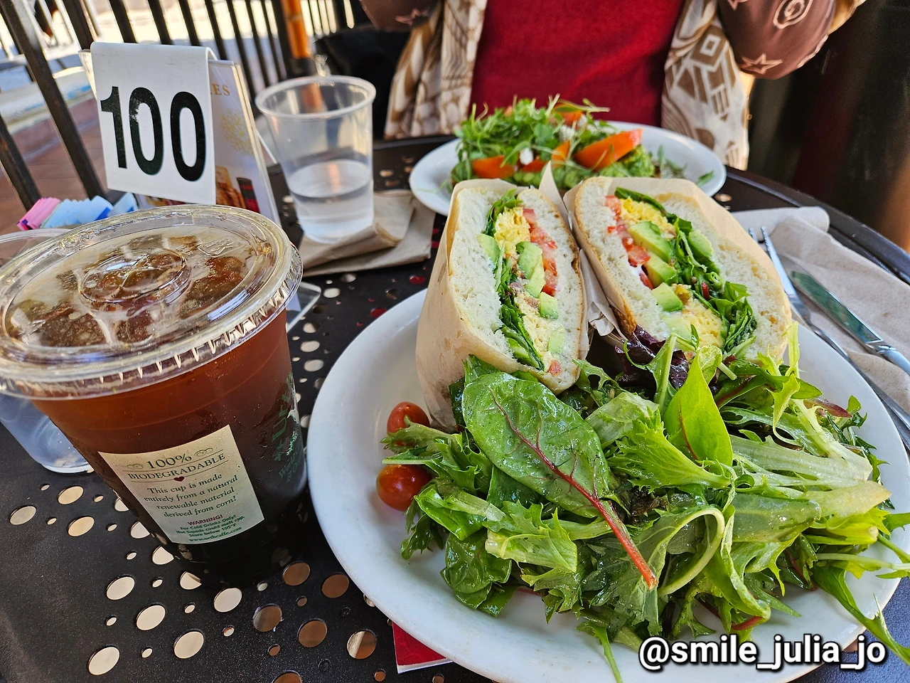 11월의 끝자락인데도 따사로운 햇빛 아래에서 다시 걸어서 Urth카페로 들어갔다. 대부분에 테이블은 야외에 있는 곳이었다. 먹고 싶은 메뉴를 찾아서 주문 후에 번호표를 가지고 테이블에 앉으면 그 번호를 보고 종업원들이 음식을 가지고 와주었다.마음에 드는 포근한 샌드위치를 즐기면서 먹는 시간이었다. 시간에 구애 없이 자유여행을 만끽하는 중이었다.