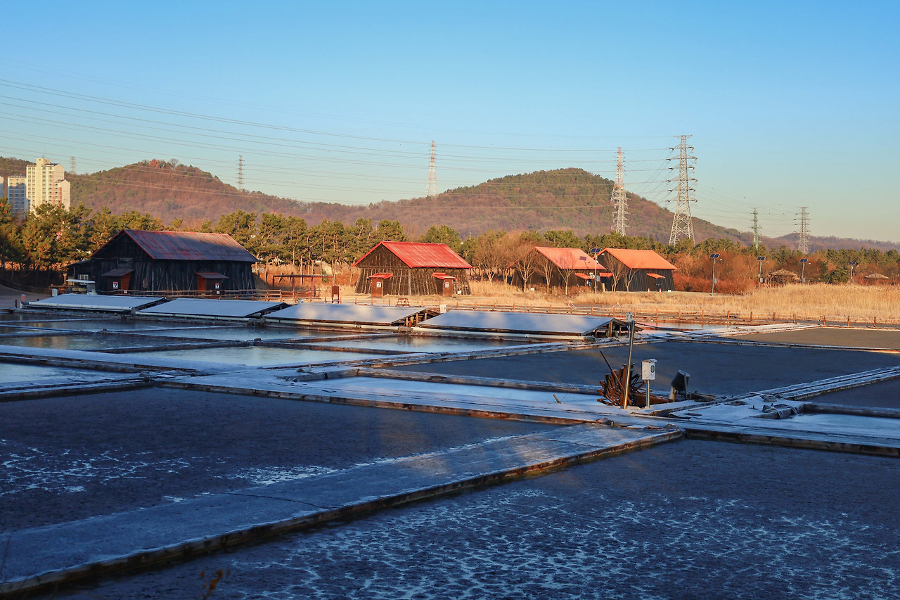 카메라 챙겨서 돌아 나오며 미끄러운 데크길을 조심조심 걸었다. 폐 염전도 보였다. 그리고 입구에 족욕장도 있다. 여름에 왔을 때는 10시부터 시작하는 족욕장도 들러서 단체로 족욕도 하고 갔다. 그런데 노천에 있는 곳이라 겨울에는 닫아 놓을지도 모르는 상황이었다.