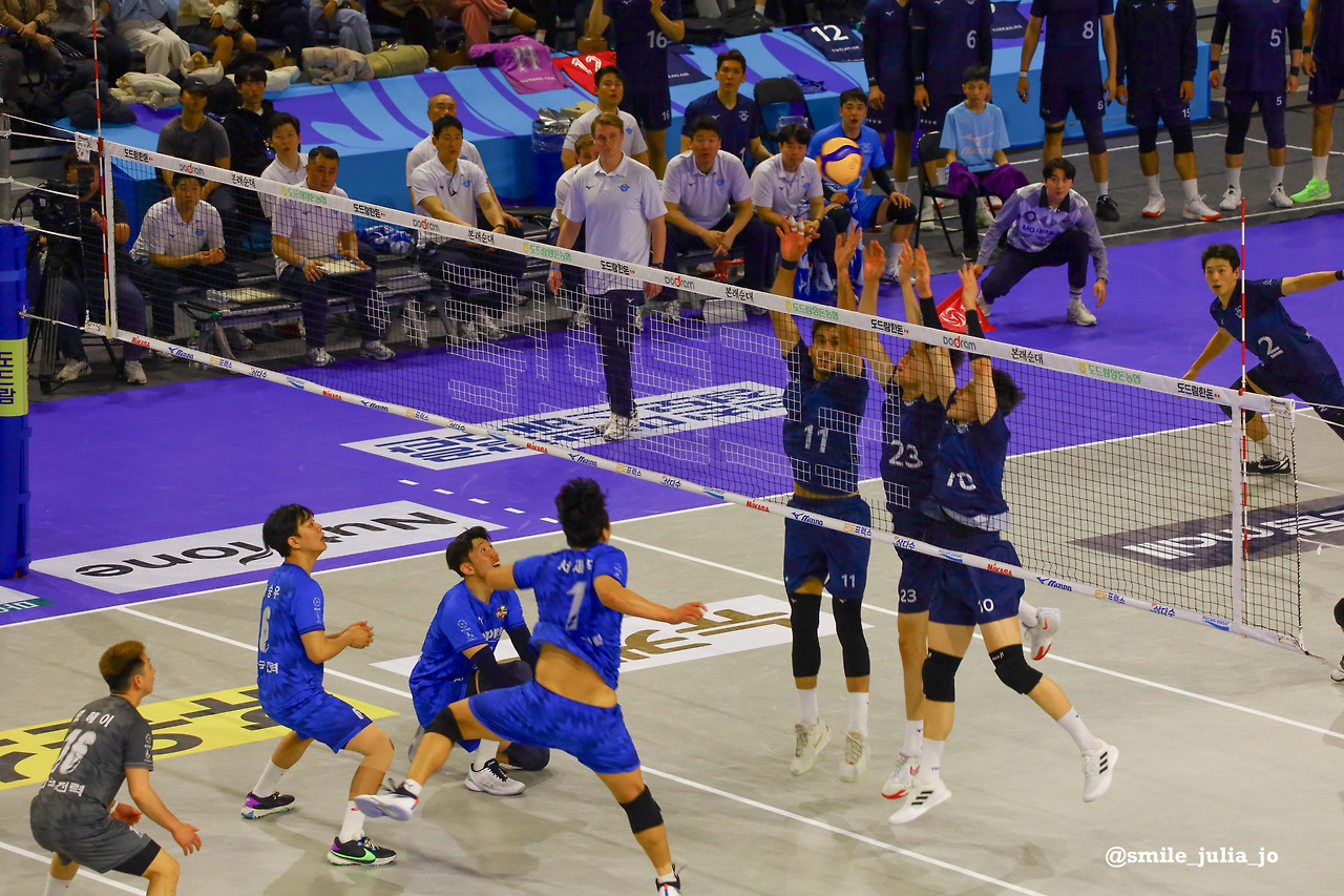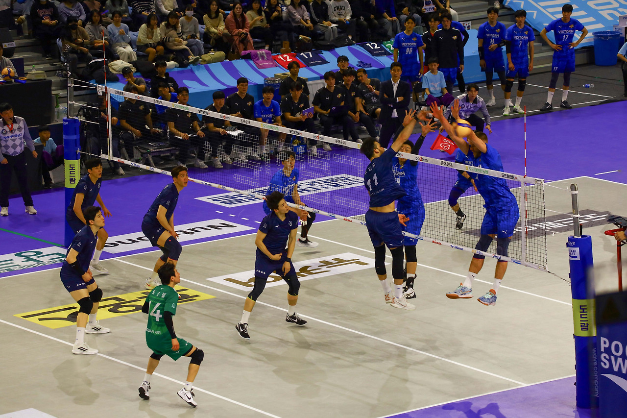 훤칠한 신체조건이 잘 어울리는 배구 선수들의 브로킹 모습이었어요.