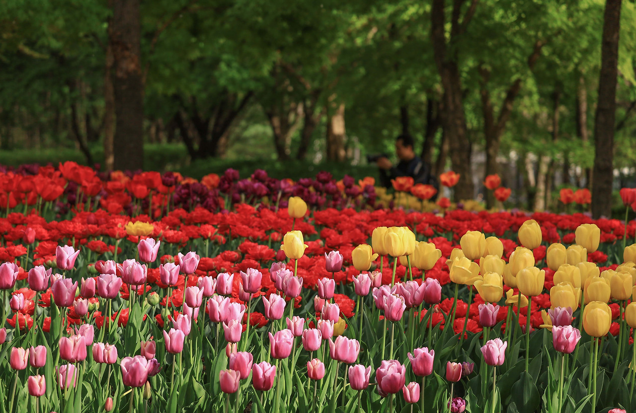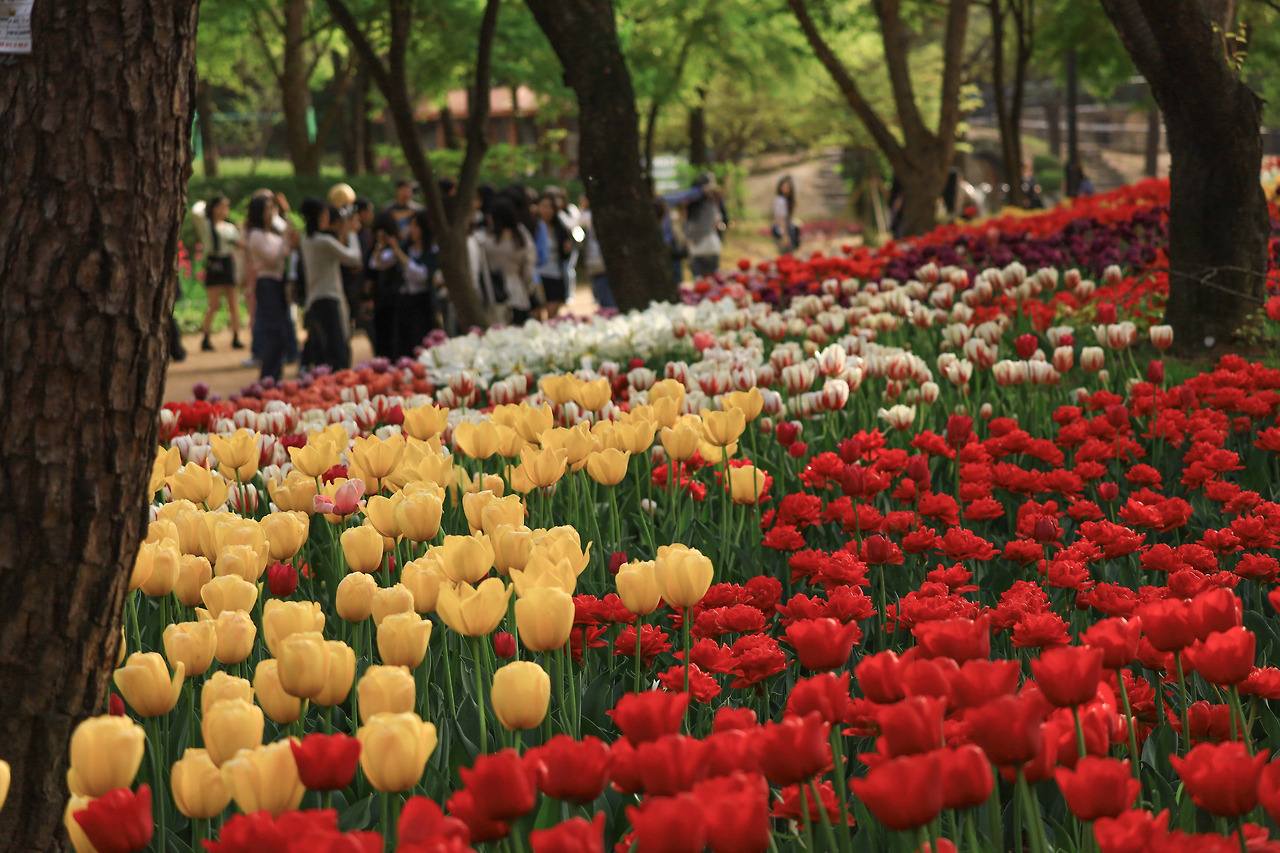 우와! 서울숲 군마상 앞에 카메라와 함께 모인 인원은 25명 정도 되었어요. 시간이 4시 30분이었고 서서히 지는 해가 되어가는 시간이었어요. 간단히 앨란비탈 박성욱사진작가의 설명을 듣고서 군마상부터 연못까지 양쪽으로 나무숲사이의 풍성하고 빽빽한 여러 가지 색의 튤립꽃을 각자 다니면서 사진 찍었어요. " 꽃사진은 -2스텦 6칸 정도 어둡게 해야 하고 빛을 활용해서 역광인지 순광인지 잘 보아야 하고 조리개 F값은 자신의 카메라의 기능대로 최대한 열어 주어야 한다" 피드백을 잘 듣고 많은 도움이 되었어요.