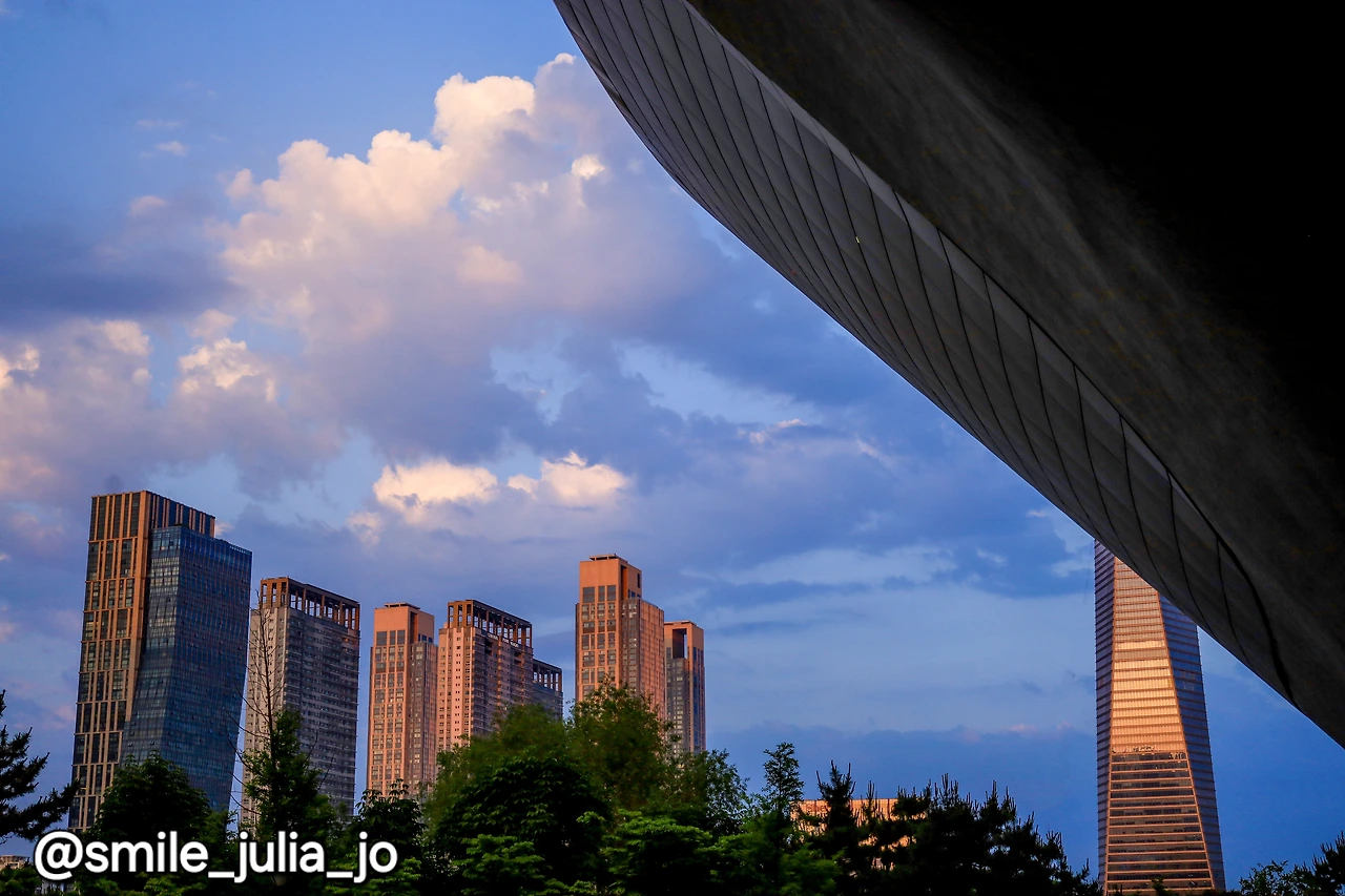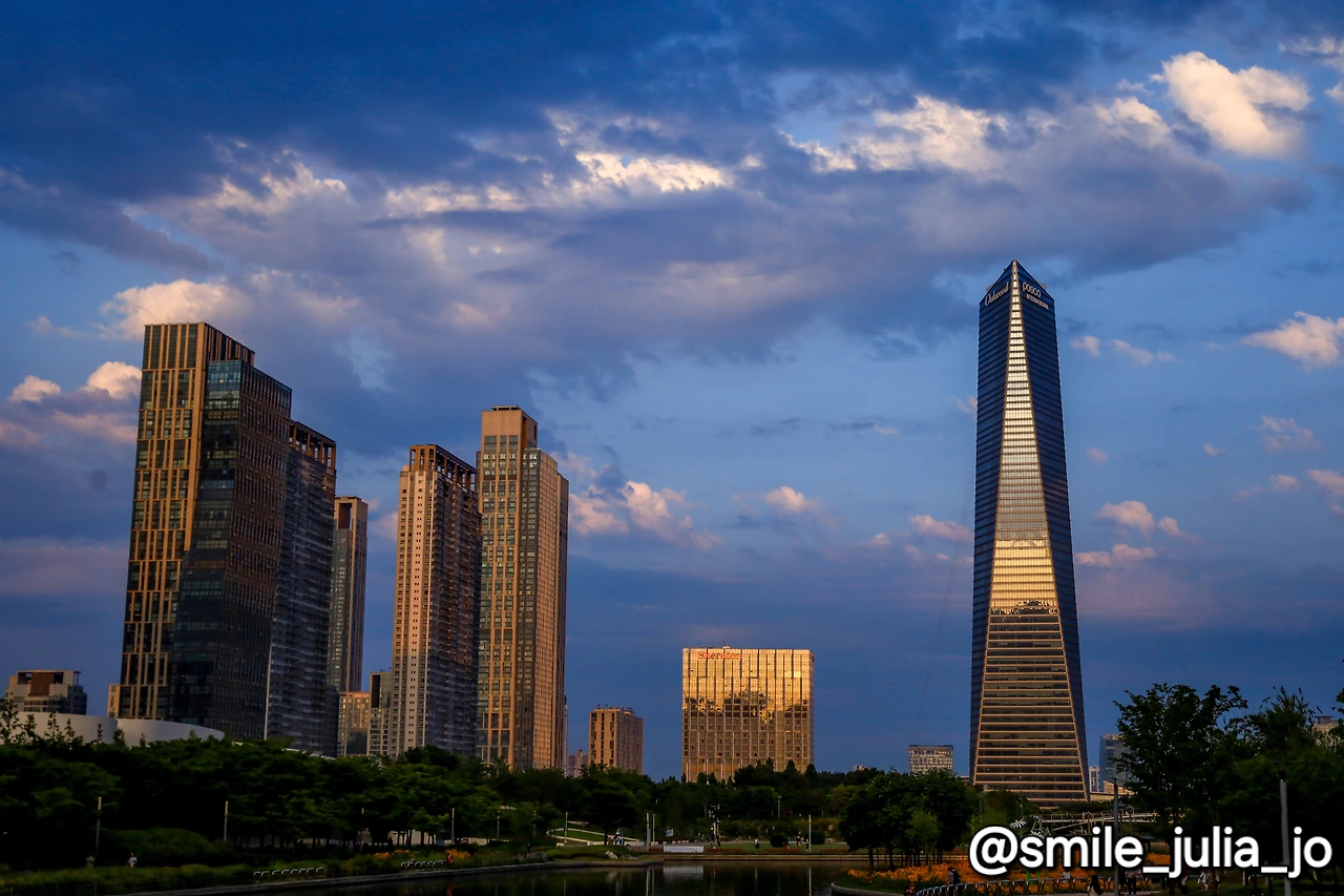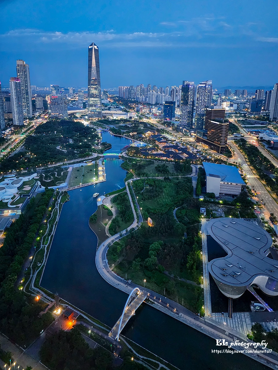 G 타워 33층에 엘리베이터로 짧은 시간에 올라가면 아름다운 센트럴파크 공원의 모습이 드론에서 보는 듯 한눈에 들어와요. 그리고 다른 방향에는 신축 중인 고층건물 모습도 볼 수 있어요. 서해바다도 멀리 보이고요.