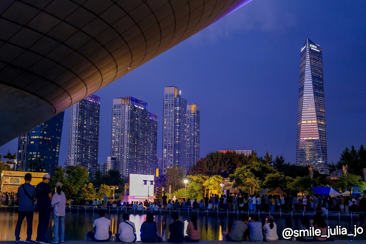 그 시간 작은 오케스트라 공연이 있어서 사회 보는 분의 멘트가 사람들을 붙잡았어요. 악기의 소리와 트라이보울과 송도국제도시 배경이 그림 같았어요.