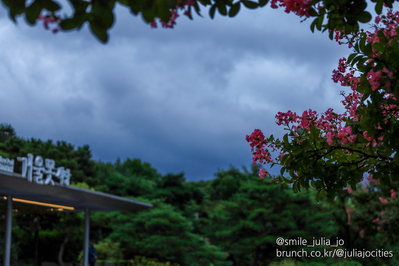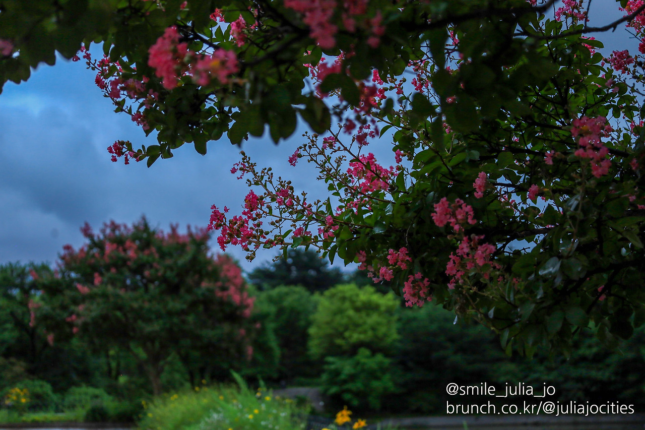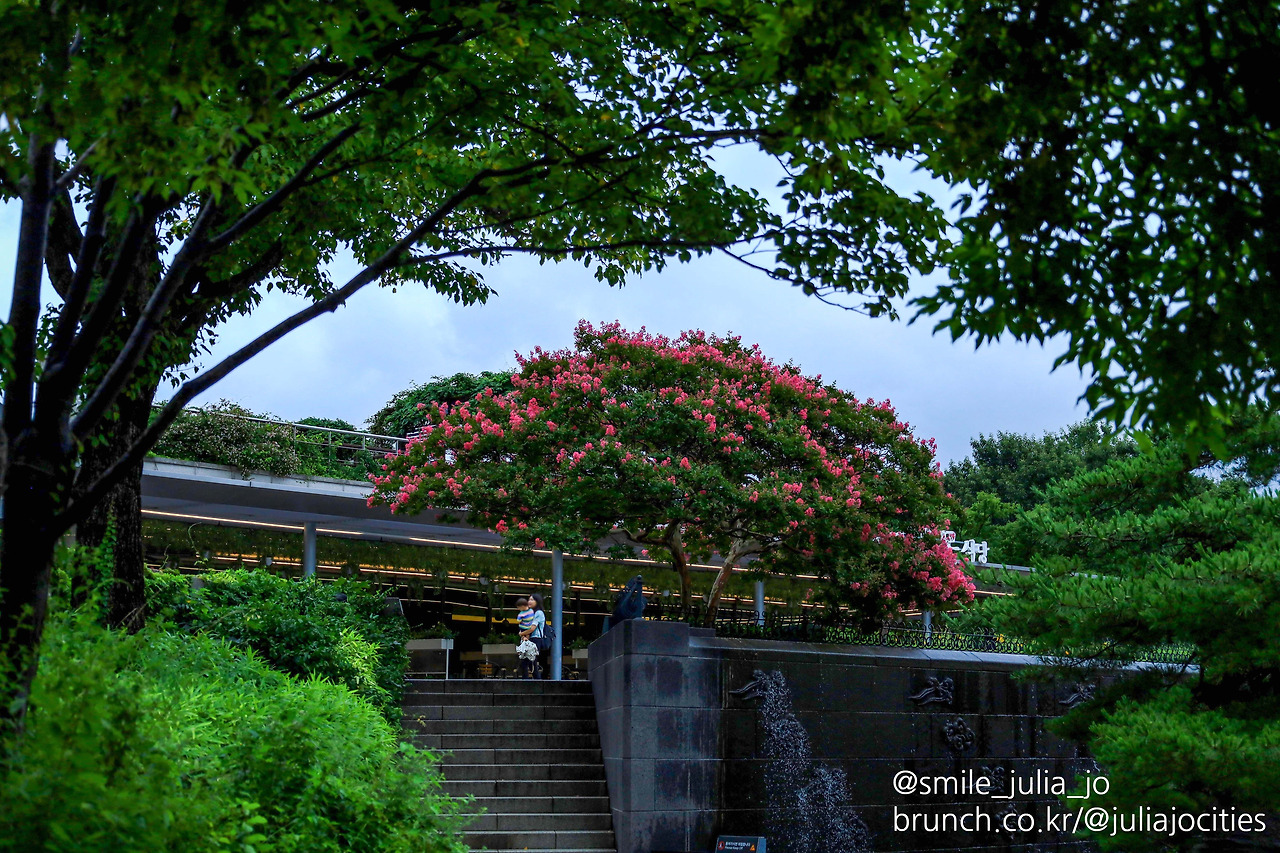 넓은 건물밖에 정원에 여름에 100일 동안 예쁜 색으로 피는 배롱나무가 먼저 눈에 띄었어요. 다른 몇 명도 카메라 들고 홍자색 꽃 예쁜 배롱나무를 우산 쓰고 사진 찍고 있었어요.