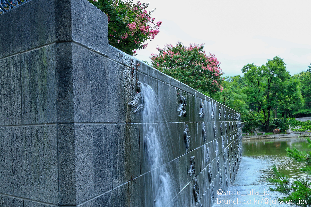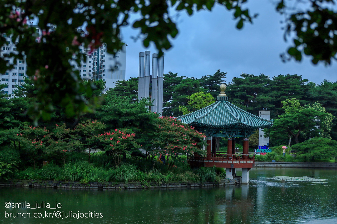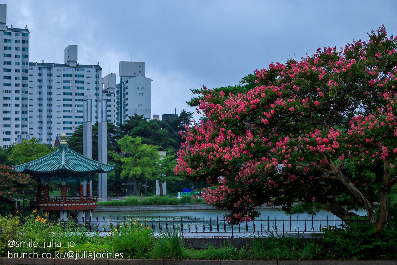 넓은 건물밖에 정원에 여름에 100일 동안 예쁜 색으로 피는 배롱나무가 먼저 눈에 띄었어요. 다른 몇 명도 카메라 들고 홍자색 꽃 예쁜 배롱나무를 우산 쓰고 사진 찍고 있었어요.